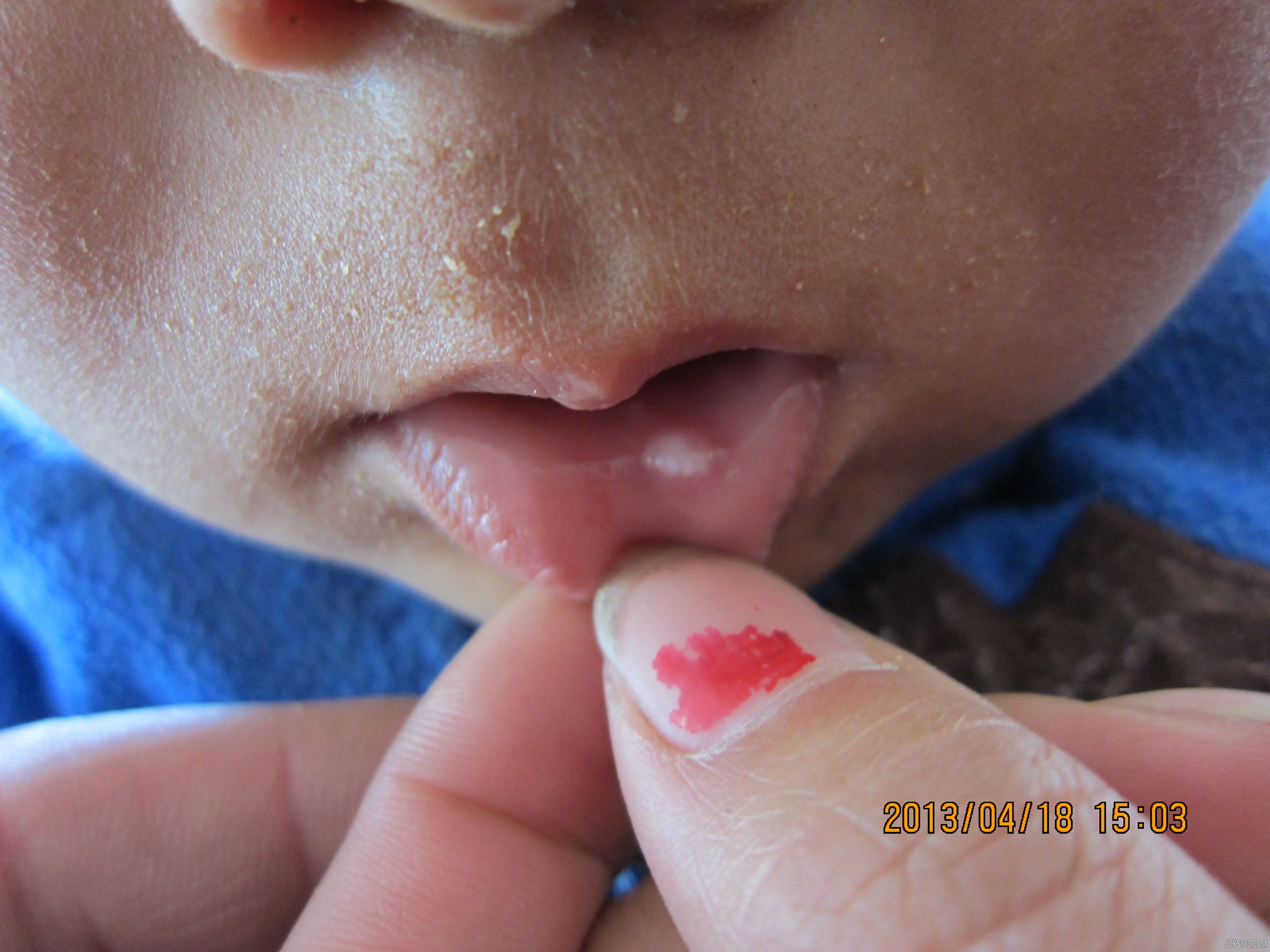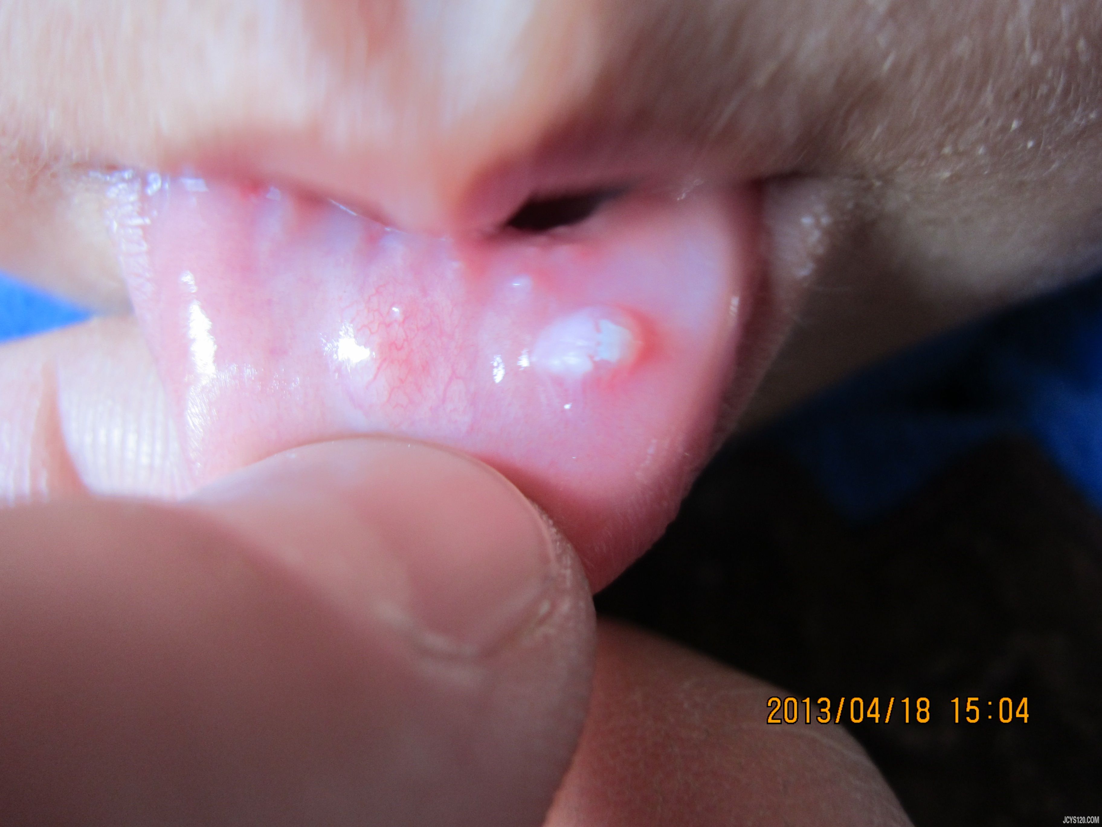 儿童,男,三岁,数天前摔伤,口腔有碰撞,下唇磕伤,伤后下唇肿胀,今日来诊,下唇有一苍白色突起,质稍硬,表面不光滑,用消毒三棱针挑破,无出血,无痛。口唇内有少许透明疱疹。