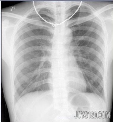 该患者在今晨40分钟前进行户外跑步锻炼大约10钟后,突感胸闷胸痛,进行性加重,并出现呼吸困难及全身冷汗。被路边熟人发现急送我院,查;P102次/分 R26次/分 T36.2度 BP120/80毫米汞柱。查体,端坐呼吸,两肩耸起,精神状态欠佳,呈急性病容,口唇轻度紫绀,颈静脉无怒张,气管略向左移位。患者右侧胸廓略显饱满,但查无畸形,皮下无捻发音,无握雪感,左肺呼吸音清,未见异常罗音。右肺中上部分呼吸音消失,语颤音减弱,叩诊呈鼓音,心音纯率齐,102次/分,各个瓣膜未闻及杂音。腹部个压痛点未见异常,生理反射纯在,病理反射未引出。
