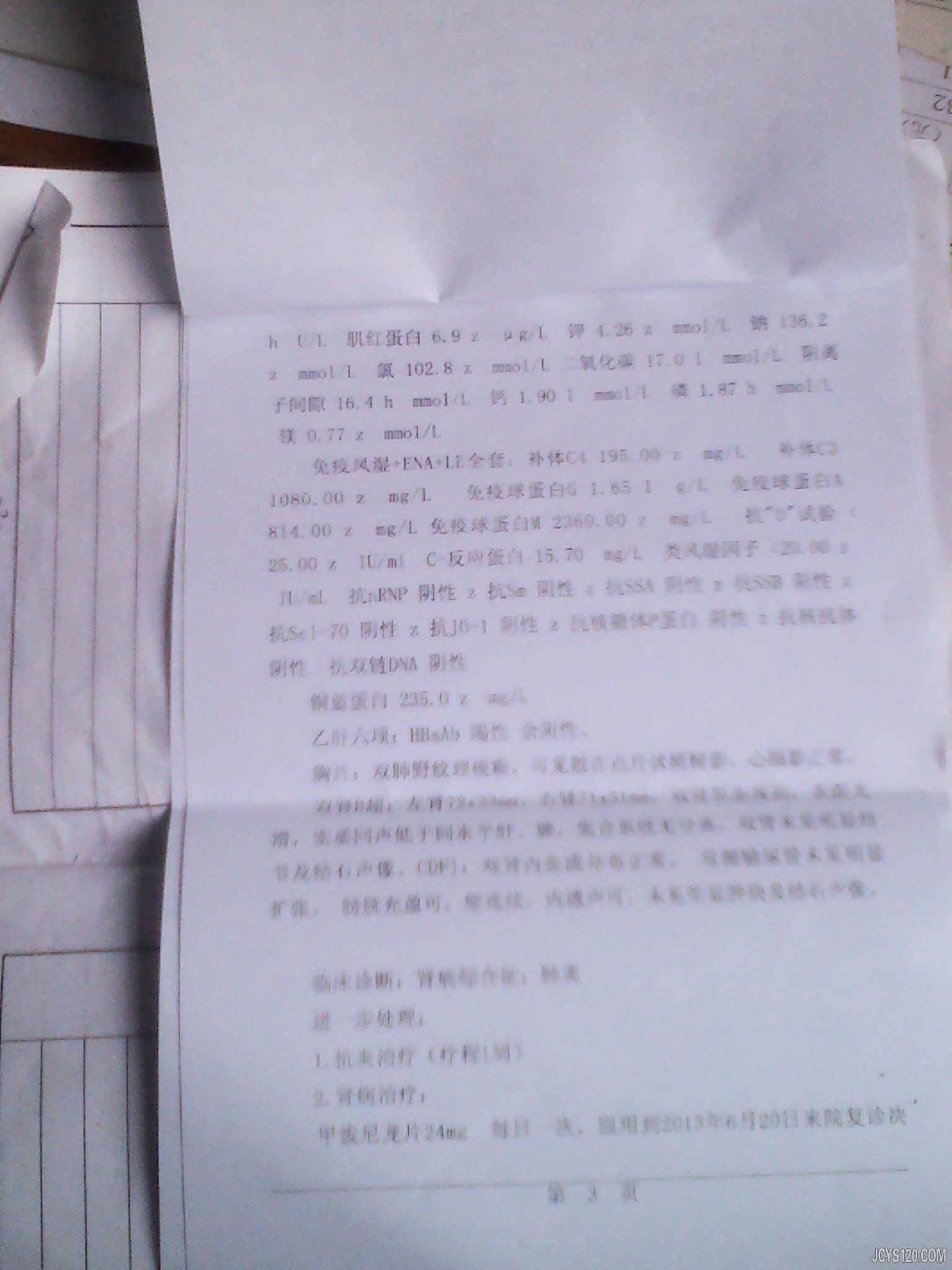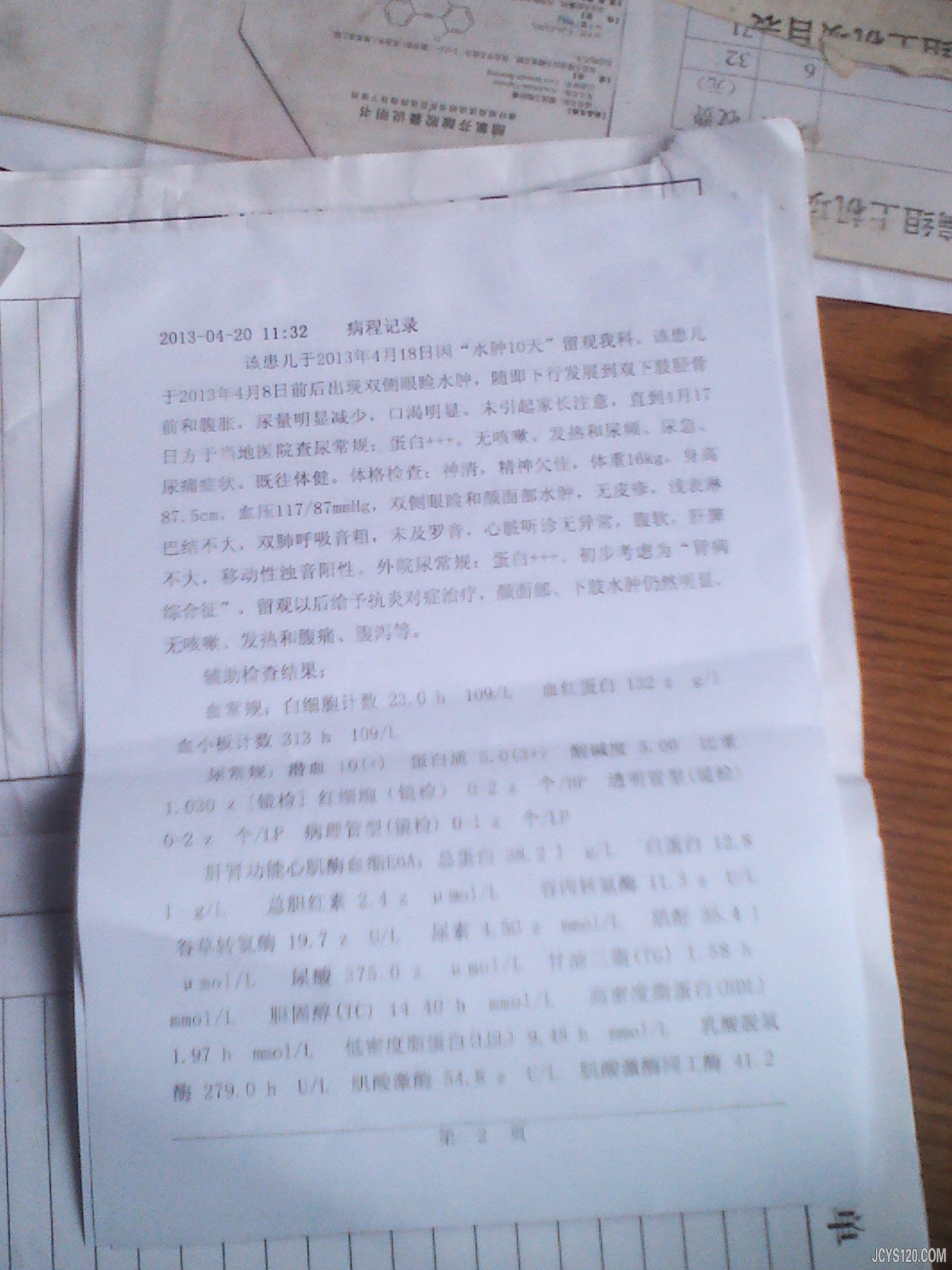 患者,男,1岁,感冒后出现眼睑和双脚踝浮肿,尿无异常的变化,到东莞市一医院检查⑩尿蛋白3+,要求到儿童医院进一步检查,会湘后检查结果如下,并口服了20天的药物,效果不是很明显,在这段时间内,小孩有几天出现感冒和腹泻等情况。 患者现有主要体征就是眼睑肿和腹部鼓胀。浮患者今日已到湘附二就诊,进一步的治疗会跟踪报道。 肾病综合症在基层我们接手的几率不是很高,而且也是比较棘手的疾病之一,希望大家踊跃讨论,精彩加分鼓励!