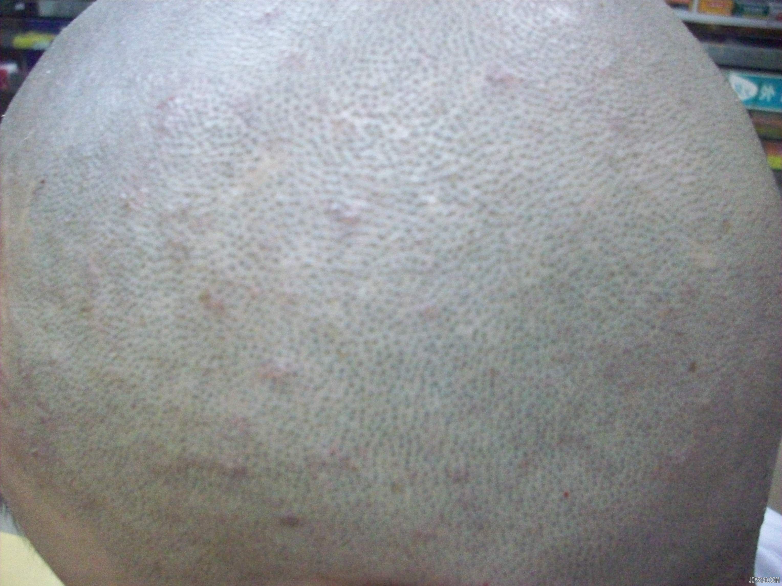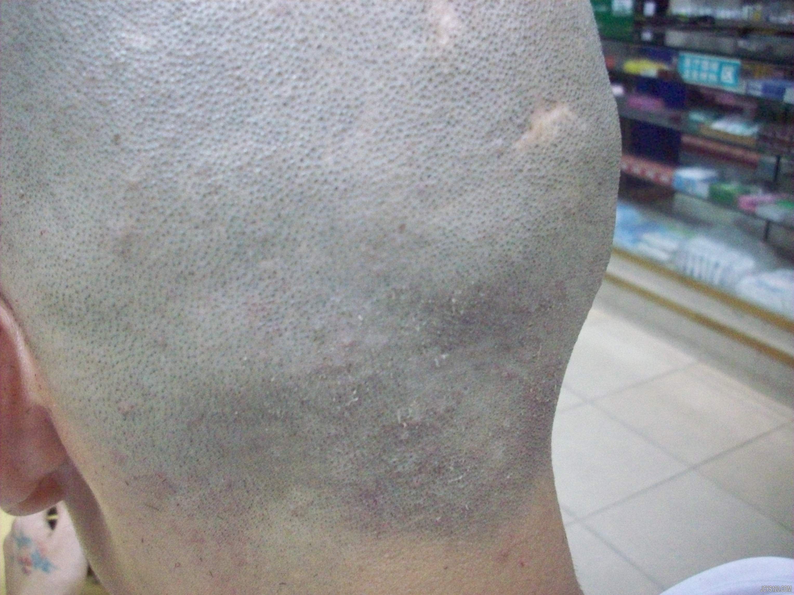 患者男性,25岁,司机,于5天前头上起丘疹,在当地以毛囊炎治疗,已用药(青霉素静滴二天,外用百多邦,祛痘一号两药膏),用药无效,于昨天来我处治疗。查头上多处有红色丘疹,成点状,无脓点,按压有痛感,患者自觉搔痒,体温37,血压未测,无淋巴结肿大,患者既往有生殖器疱疹,尖锐湿疣史。