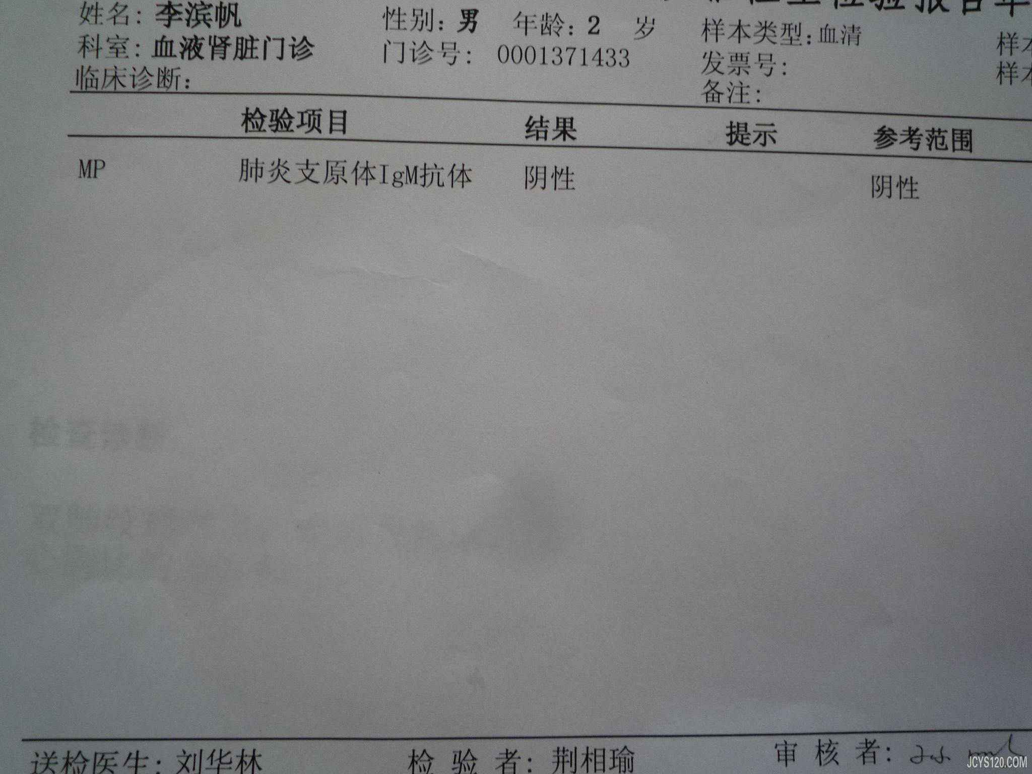 查体:体温36.5 (在来之前口服退热药物),营养可,精神可,全身皮肤无黄染,无出血点。淋巴结未触及肿大,双肺呼吸音粗,未闻及干湿罗音。心音心率(-)腹部平软,肠鸣音正常,颈部无抵抗,生理反射存在,病理反射未引出。