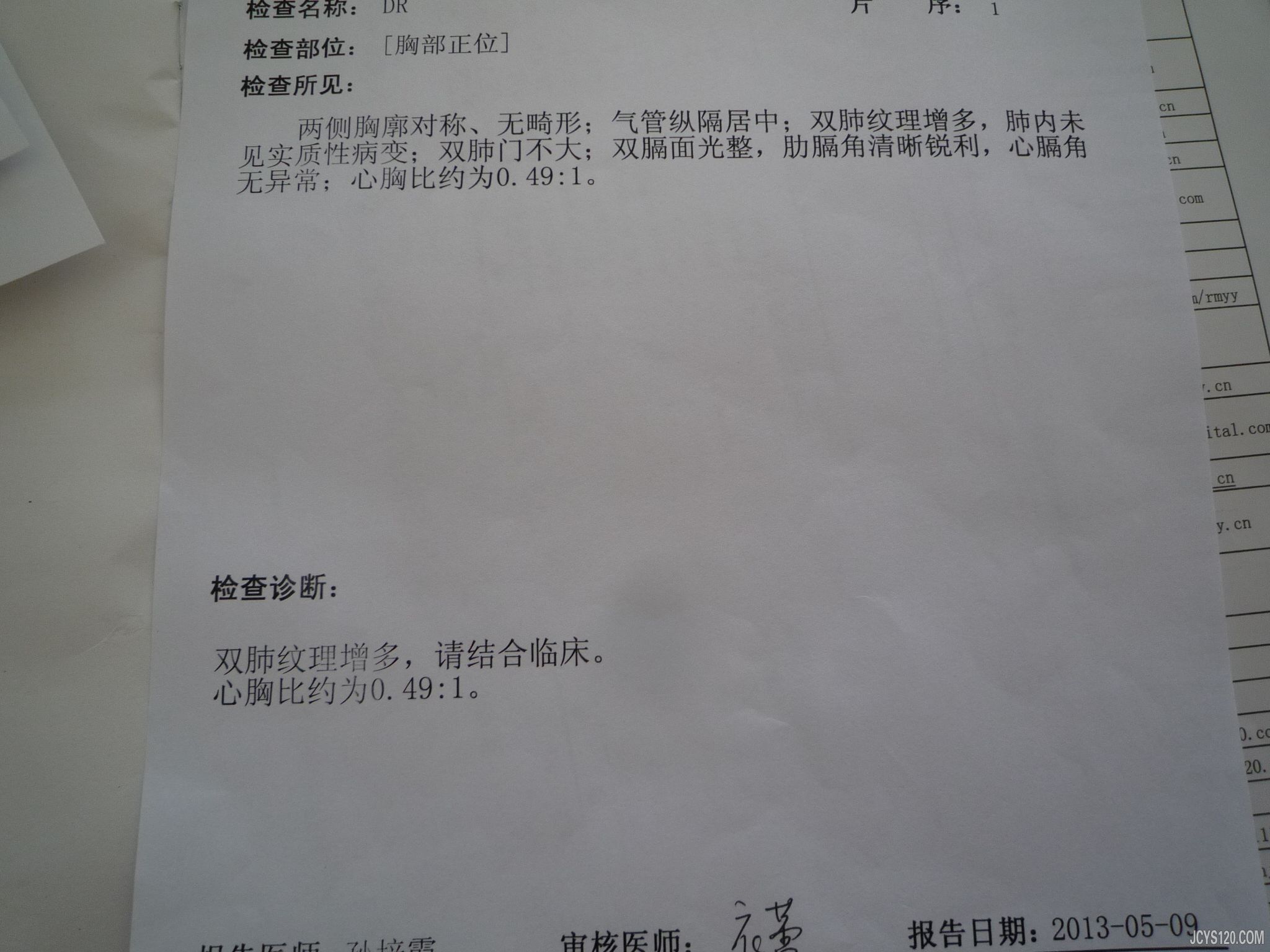 现病史:小患者于7天前开始咳嗽,时轻时重,咳嗽有痰,小儿不会吐痰反而又咽下,睡觉时不咳嗽,不喘。在家诊所输液治疗(具体药物不详)4天,效果不是很理想,昨天晚上发烧38度,口服退热药,几小时后体温正常,今早上体温再一次上高38.5度,又口服退热药(小儿布洛芬混悬液)1小时候以后体温逐渐正常,今上午去市医院检查。