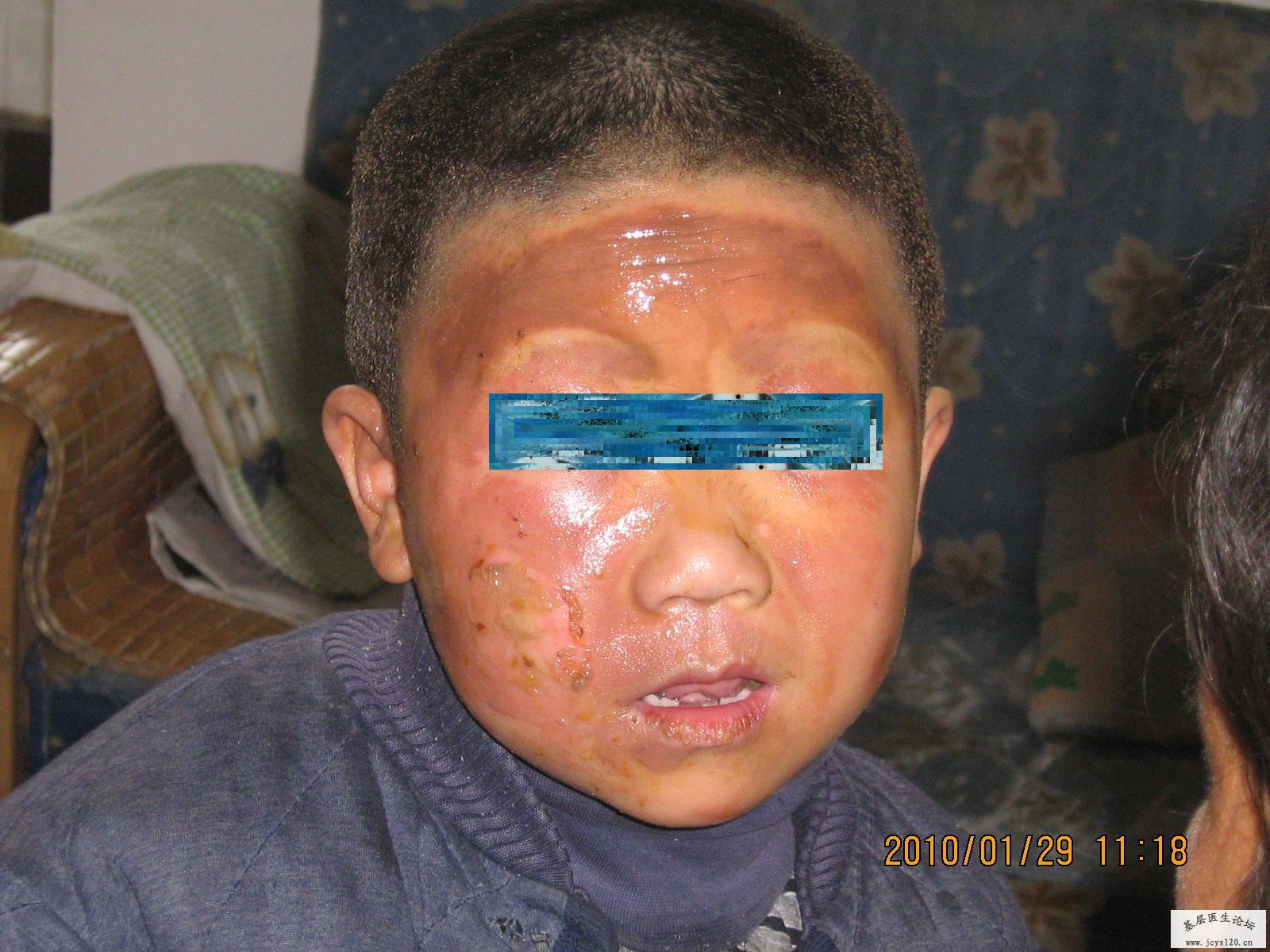 患者,男,10岁,四天前(元月25日)被不明火烧伤面部及耳部,以左面颊部严重,局部疼痛,红肿,水泡,在合肥市第五人民医院外科诊断为:面部烧伤2度,占3%皮肤面积,住院治疗三天,给予湿润烧伤膏局部外用,每四小时一次,TAT1500IU,肌注,皮试(—);5%GS250ml+青霉素320万静脉滴,皮试(—),每日一次。症状有所好转,但面部肿胀严重,双眼睁开困难,患儿吵闹,家长要求转院,于昨晚7时左右转入我处。体查:体温,血压,心肺正常,呼吸平稳,口腔五损伤;面部红肿,以左面颊严重,双眼睁开困难,局部水泡破裂。一边采血送检:肝肾功能,电解质。一边处理如下:第一:左面颊水泡破裂处生理盐水冲洗,外用1%磺胺啶银霜,然后覆以多层棉纱;其余生理盐水冲洗,外用1%磺胺啶银霜;第二: 0.9%NS100ml+头孢曲松1.0 静脉滴注ST!;5%GS250ml+维生素C2.0 静脉滴注,;0.9%NS100ml+0.3 静脉滴注。维生素C滴注完时,送检结果出来,肝肾功能正常,电解质正常;输完液体嘱咐家长注意事项,回去。今早10时患者来诊:面部消肿,疼痛消失,右眼睑能睁,可见双眼皮;左眼睑肿胀消退;给予: 0.9%NS100ml+头孢曲松1.0 静脉滴注,每日两次;5%GS250ml+维生素C2.0 静脉滴注,每日一次;0.9%NS100ml+0.3 静脉滴注 每日两次,维持治疗一周。 从治疗的结果看,该患者主要是因为局部感染未有效控制所致局部症状消退慢,应该加强抗感染治疗,同时及时处理局部病损部位。