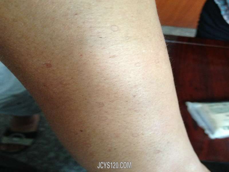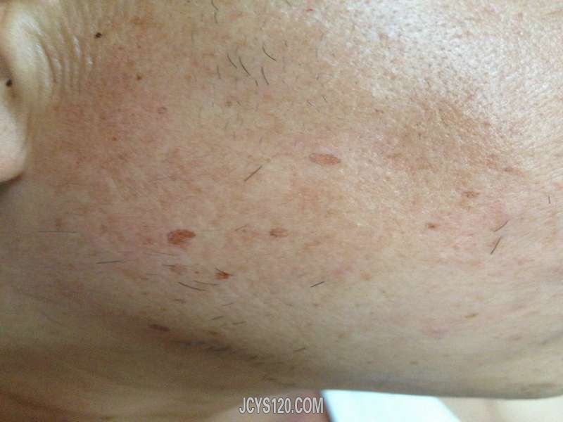 患者,男性,46岁,职业司机。患者近日来诊,皮肤损害鉴于面颈部和上肢伸侧。起病于去年夏天,中间慢慢减轻,今年夏天明显加重,数量增多,在本县几个私人皮肤专科都看过,皮肤科都说不出个所以然。皮损中央略微凹陷、边缘轻度隆起,颜色淡黑。未见鳞屑。不痛不痒。上传图片如下,请大家判断是什么疾病。