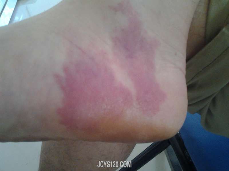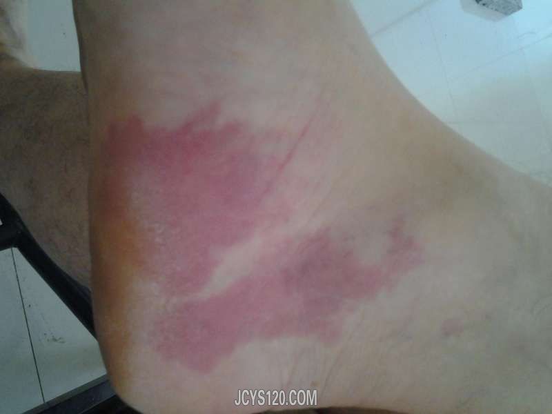 由于高温酷暑,开空调时过于贪凉致上呼吸道感染来卫生室诊治给予抗病毒,补液对症处理,闲聊时突然看到患者右脚内踝下端见到面积挺大一块红斑疹,不痛不痒,无高凸皮肤,皮肤光滑,无血管走形,无充血现象。