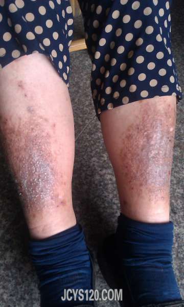 吴某,女,72岁 双下肢皮肤渐进性瘙痒,变硬,发黑四年。 四年前只是胫前一米粒小疹,发痒,后来发展如下图。