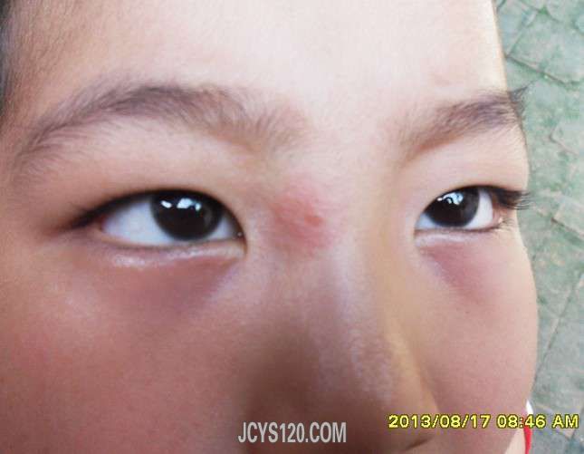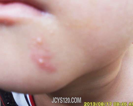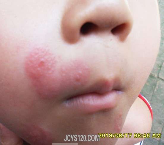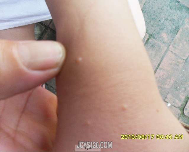 大家看一下这是什么 患儿6岁 7天前无诱因面部出现白色丘疹 家属言起初与图中手臂上的一样 曾在别处诊所按疣病治疗 用药不祥 效果不明显 后又转一家诊所 静滴清开灵 外用阿昔洛韦 第二天出现明显红晕 及瘙痒 今日前来求诊 我感觉像个湿疹 大家给鉴定鉴定 第一次发图片 弄得不好 大家不要见笑:jy: