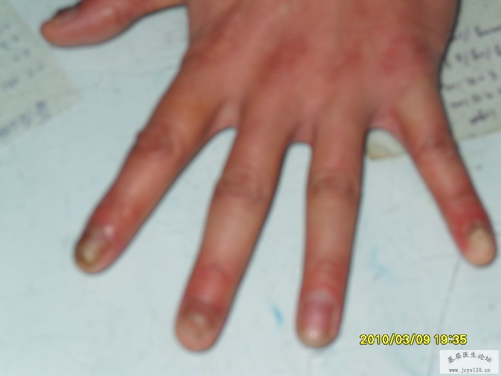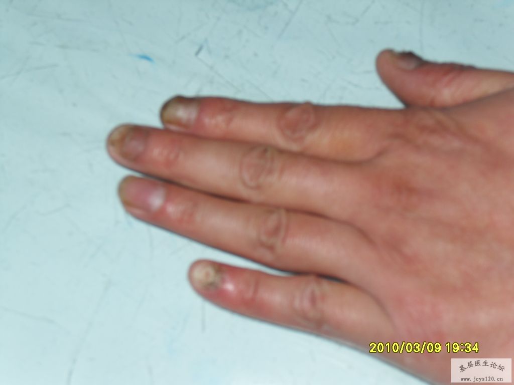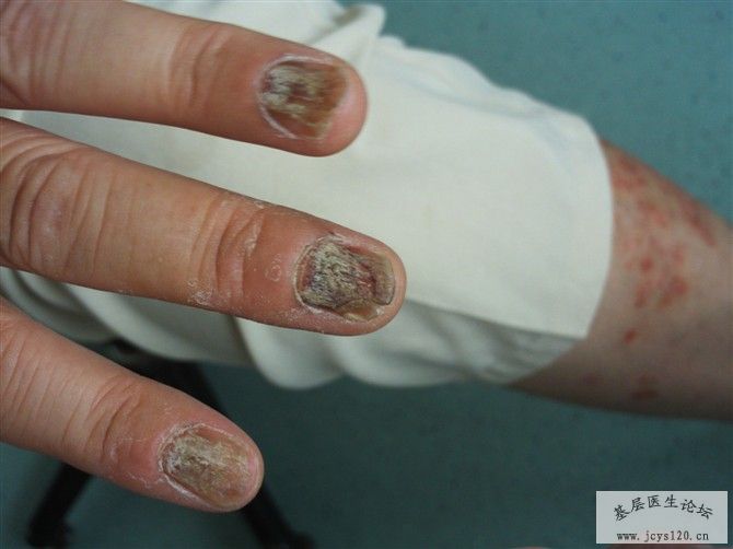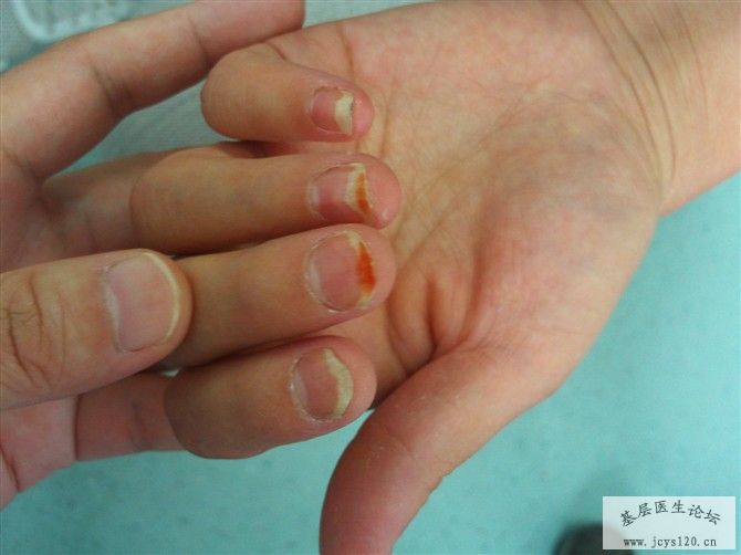 非常感谢降紫琳枫的参与。我看到县、市有不少专治甲病的连锁店,一天的纯收入不次于一个门诊,而且诊断有误,为此征集甲病,告诉大家的鉴别、诊断与治疗,提高自己的业务水平,增加同事们的收入。 甲真菌病(灰指甲)是由皮肤癣菌和皮肤癣菌以外的真菌包括酵母菌等均可侵犯甲板,所引起的指、趾甲感染统称为家真菌病。 临床表现为甲板增厚、变色、混浊、无光泽、缺损、表面凸凹不平、甲分离、脱落,或伴甲沟炎。临床上分为四种类型【1】浅表白色型甲真菌病 【2】远端侧位甲下型甲真菌病【3】近端甲下型甲真菌病【4】全营养不良型甲真菌病。 治疗要点 【1】局部治疗 【2】系统治疗 主要是内服抗真菌药,一般适用于病情较重或病甲较多者。【3】联合治疗。 伊曲康唑 200mg bid 每月七天,一个疗程,连服3个疗程。 阿莫罗芬甲涂剂 外用 每周一次或40%冰醋酸溶液 外用 tid 鉴别诊断 应与甲营养不良、银屑病、慢性湿疹等引起的甲病相鉴别。