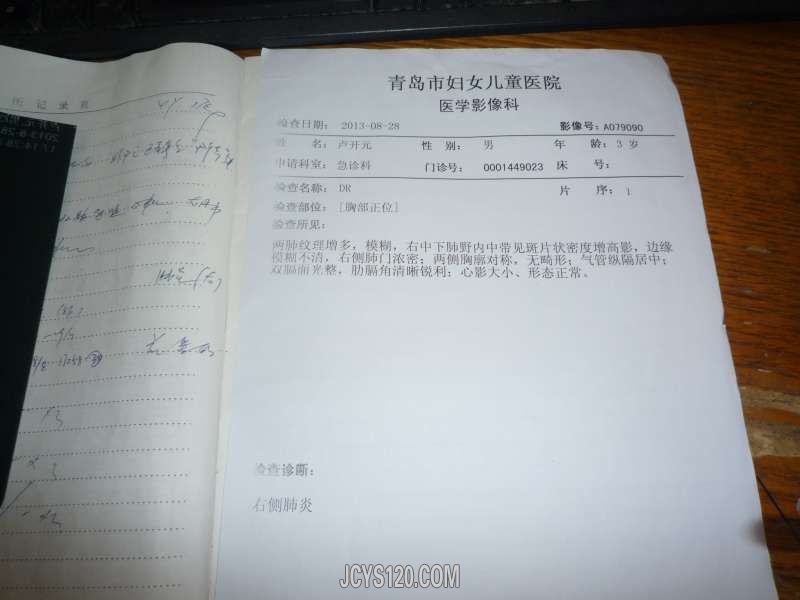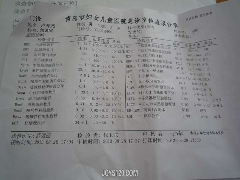 现病史:小患者于13天前出现发烧最高体温38.9,每天下午发烧,在家家长自行服药,头孢拉定颗粒,护彤小儿感冒颗粒,小儿布洛芬等,每次服药后大汗淋漓热退,精神不减,饮食可,3天后还是发烧又到乡镇医院就诊,乡镇医院诊断:“上感”嘱其在家继续服药观察,7天后还是始终发烧不减,每天下午晚上都发烧,38-38.5度又到市医院就诊化验血常规,肺部正侧位片均正常,于是就回家在其诊所输液治疗五天:阿奇霉素 炎琥宁(口服头孢克圬片,小柴胡颗粒 ),输液5天始终每天下午发烧38度左右,开始伴有咳嗽(咳嗽次数逐渐增多,伴有粘痰,小儿不会吐痰伴有痰鸣音),又来我诊所就诊。