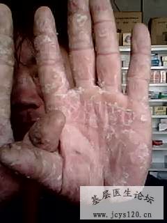 患者,男41岁,建筑工人,常年在工地干活(在本村盖房),患者一年前发现手掌触摸时有微小硬结,很像小丘疹,稍痒,即而开始脱皮,没用理会,于一月前发现脱皮严重,手掌变得粗糙,没有痒感,无痛,曾经自己买过达克宁涂抹没有效果,今天来诊,我拍了患者的手掌照片,求教各位同仁,到底是不是手癣,应该怎样治疗,我想中药治疗应该效果好,但是感觉无从下手,因为西药软膏之类的含有少量激素,用药久了会长生抗药性,毛孔增大,不利于根治。