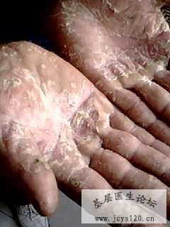 患者,男41岁,建筑工人,常年在工地干活(在本村盖房),患者一年前发现手掌触摸时有微小硬结,很像小丘疹,稍痒,即而开始脱皮,没用理会,于一月前发现脱皮严重,手掌变得粗糙,没有痒感,无痛,曾经自己买过达克宁涂抹没有效果,今天来诊,我拍了患者的手掌照片,求教各位同仁,到底是不是手癣,应该怎样治疗,我想中药治疗应该效果好,但是感觉无从下手,因为西药软膏之类的含有少量激素,用药久了会长生抗药性,毛孔增大,不利于根治。[/size]