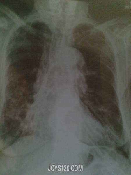 患者7天前因受凉后感到恶寒,无发热,继之咳嗽,阵发性,白色泡沫性痰液,伴胸闷明显,无胸痛,盗汗,乏力,家里有消炎药和止咳药吃了几顿,病情没有减轻,反而加重,痰中有血丝,于是在家人的护送下来到县医院拍片示为右下肺多发性肺囊肿伴慢性感染和心脏扩大,要求住院治疗,患者拒绝带药回家,GS500ml+阿奇霉素0.5vgtt,qd.×三天,阿莫西林分散片0.5tid,必漱平16mgtid.第四天效果不显。