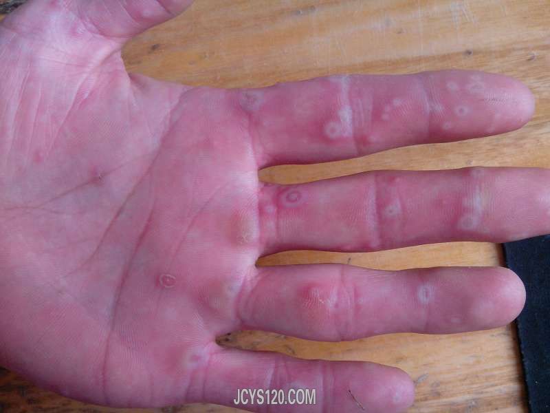 患者,男性,27岁,货车司机,无明显诱因出现双手掌皮疹,伴有刺痒,无疼痛,无发热,局部皮肤无破溃,具体见图片,皮疹触之不痛,不硬,患者否认有化学物品和刺激性物品接触,不知道诊断,已经让患者去皮肤科就诊: