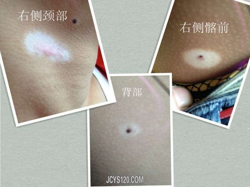 患者 男 16岁,十年前右侧颈部发现白色斑片,中央有一黑色色痣,当地医院给激光去除,白色斑片没有消退,并留有瘢痕,近几年右髂前、背部也出现类似皮损,