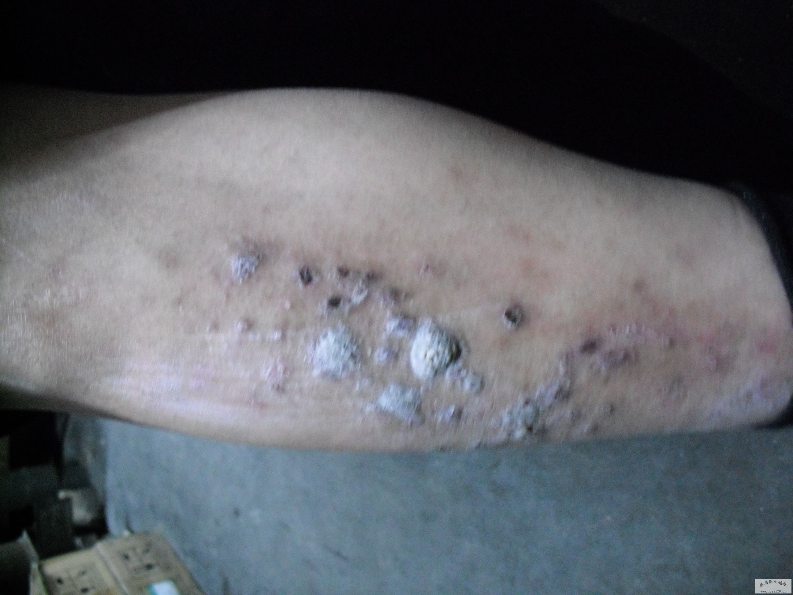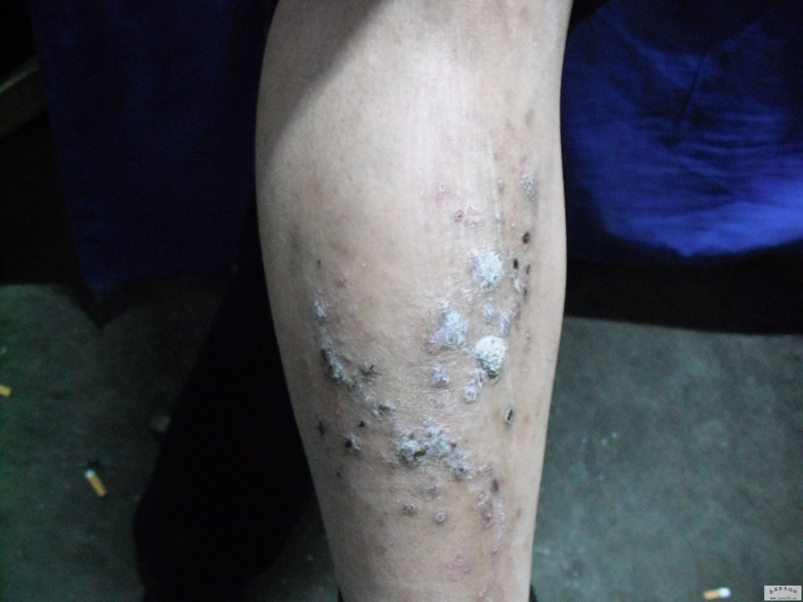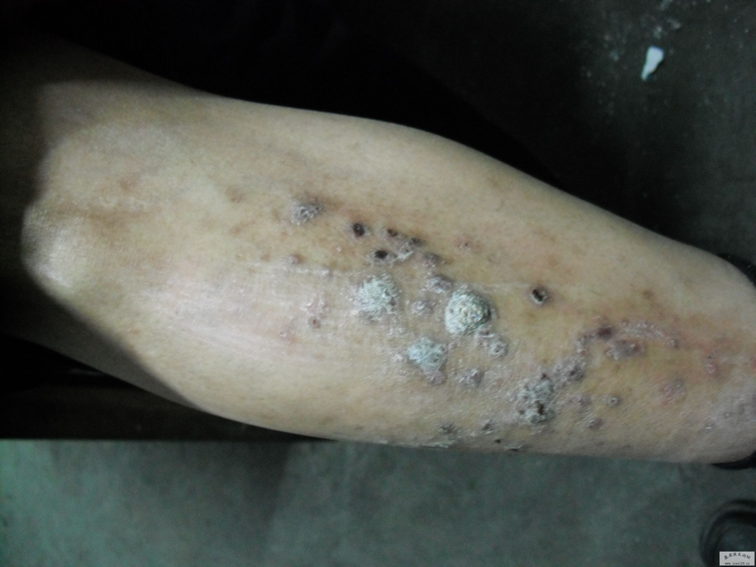 患者,男,52岁,一年前出现小腿丘疹,特别痒,经常抓挠,现在就成了这个样子了,用过皮康王,皮炎平,效果不理想,请大家给出自己的诊断及治疗方法,因为我中药知识缺乏,希望求助于中医,西医有好的方法当然更好,谢谢大家。