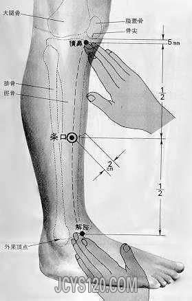 从下巨虚穴往膝盖方向,即向上1寸的位置有一个穴位,就是条口穴。“条”是好多条胡同的意思,“条口”就是胡同口。把脚往前伸直,迎面骨处正好有一块肌肉,其下缘的点就是条口穴。