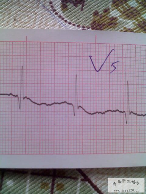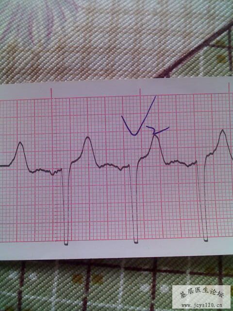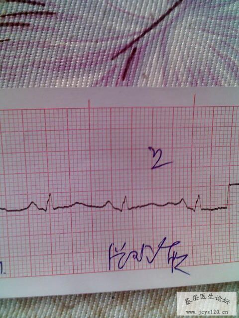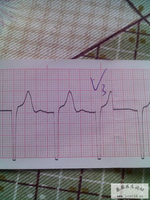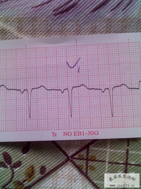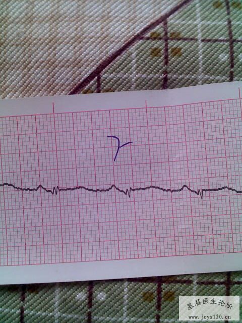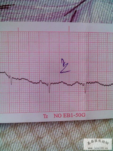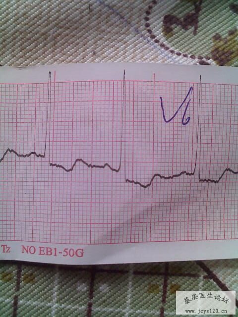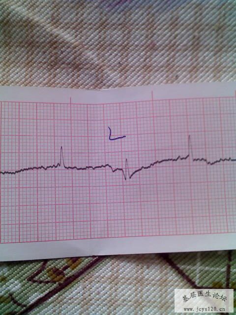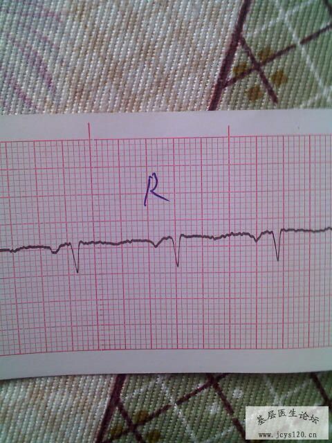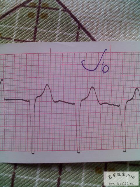 现病史 患者夜间咳嗽,胸闷3天,咳少量黑色粘痰,无痉挛性咳嗽及咳血,述左前胸压缩感,无胸痛,在中心卫生院检查胸片示:肺纹理增多增粗,以右侧肺门显著,心胸比例增大。血常规示白细胞68000 心电图如图。医院给予丹参片3片日3 口服,地奥心血康2粒日3口服,救心丸4粒必要时舌下含服,用药天无好转来我处要求输液。发病以来纳差,无力