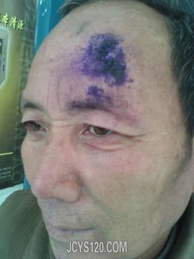 外伤史:举图片考虑软组织挫伤,如颅脑及其他部位合并伤,不需特殊处理,皮损处碘伏外用,其余伤处硫酸镁外敷。
