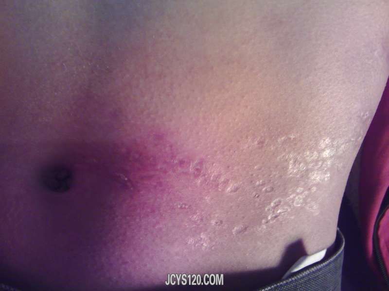 男性患者,年龄三十七,之前已在一个民间“高手”和某医院治疗三天,皮疹出现三天,疼痛加剧,这个病例很有意思的就是出疹之前没有腹痛,今天说昨晚开始肚脐周至胸窝开始感觉中度腹痛,向左侧胸胁放射,大家可以想象,带状疱疹疼痛加上腹痛患者是一个什么状况。一个三十七岁从事重体力劳动的汉子,平素身体健康,吃饭吧吧香,现在已经四顿没有进米饭了,就吃了一个香蕉和一点水,几天几夜没有睡好,有图有真相,至于疱疹的形态和分布就不赘述,舌诊大概看了一下 ,不过要真是书面格式化我也可以修饰一下舌质红苔黄腻,一副肝经湿热的样子(窃笑,以前和现在写病历也干过这种勾当,不过是偶尔为之),上传图片 ,因为个人工作时间关系,只能拍到该病例的这些图片,后来问我父亲该患者治疗四天,感觉只有瘙痒并无疼痛了,皮疹虽未全部消失,但是水疱已经塌陷,因为是一个农民工,感觉不疼了,因为经济原因,之后就在也没有来治疗了,不过留了电话,前几天我问我父亲患者怎么样了,是否皮疹已经痊愈,是否已无神经痛?父亲说后来其妻子感冒来买过药,已经痊愈,说了一堆感谢夸赞的话,如此看来,效果还是不错的了,我父亲在治疗这个带状疱疹,在本地还是小有名气的,我也是真切的感受到这个治疗效果还算是比较理想,我也曾经说过带状疱疹你要说你能治好,一定是一些严重的病例能够及时的控制皮疹,更为重要的是不要遗留后遗神经痛,这才能反映出治疗水平,在此我也想说,我父亲不是神医,有一些病例我也看到过,还是会有后遗神经痛的,一般都是些相当严重的患者,但是大部分还是收到比较理想的效果,总之吧个人感觉大部分患者应该是有治疗效果的,不是自愈。