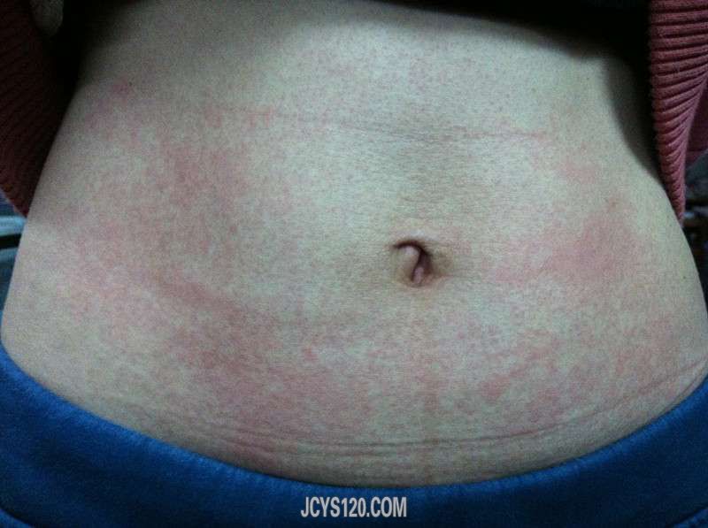 对面店的老板娘,冬天,说洗澡后出来肚子下就全是红的 一大片,平时不会的,今天第二天了,有一点点痒,求助于我,对于皮肤科我是一点也不懂,各位同仁 请帮我看下?我先让她去擦醋酸氟轻松冰片乳膏。