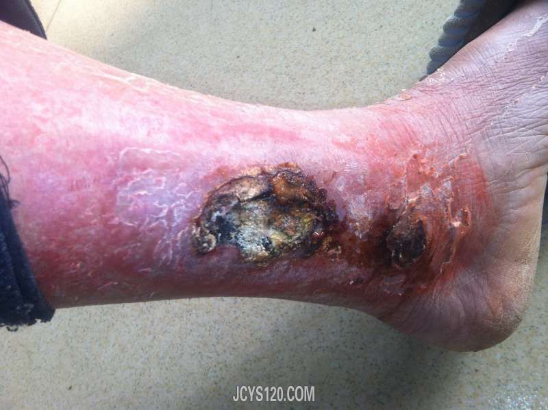 这是一组足背外感染的病例。男,65岁,2013年12月1日因外伤在县人民医院住院治疗,15天后自行出院在家治疗(草药)无效,经人介绍前往我处试行治疗。