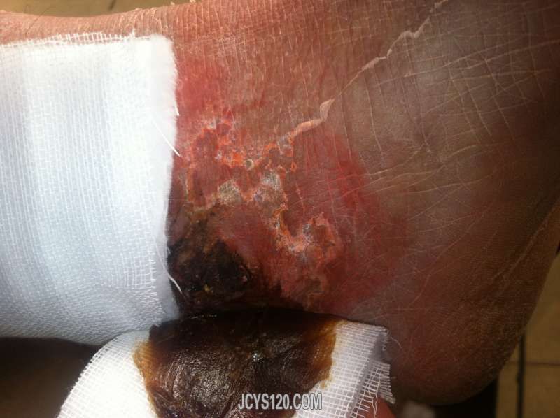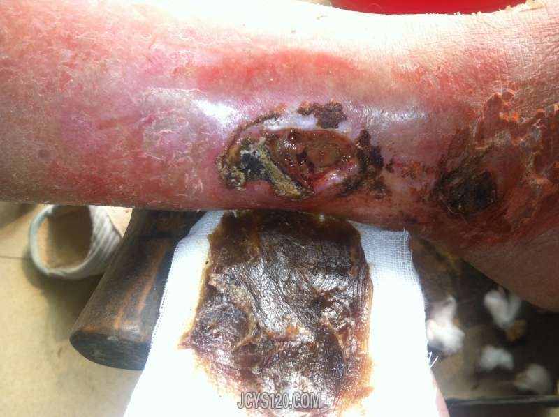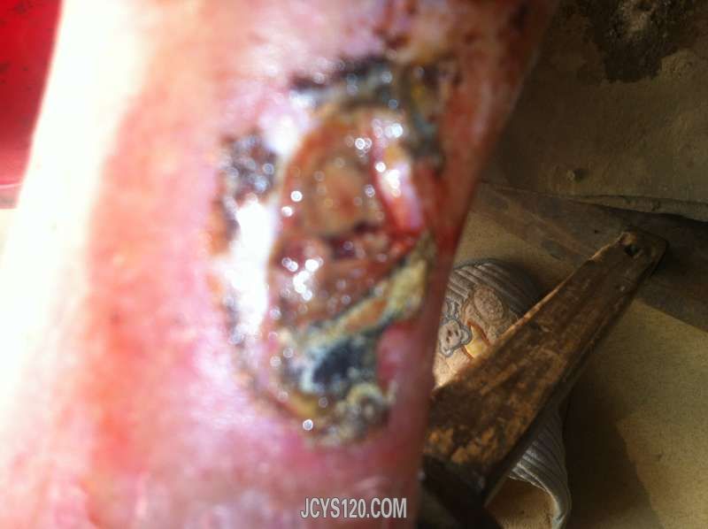 这是羊毛脂膏治疗了第二天,伤口周围坏死组织减少