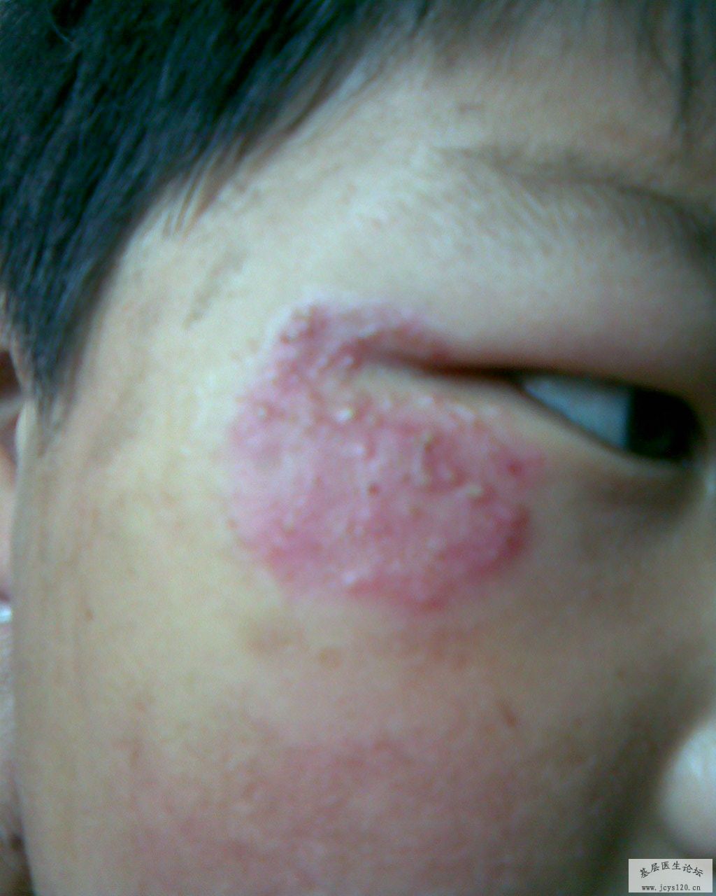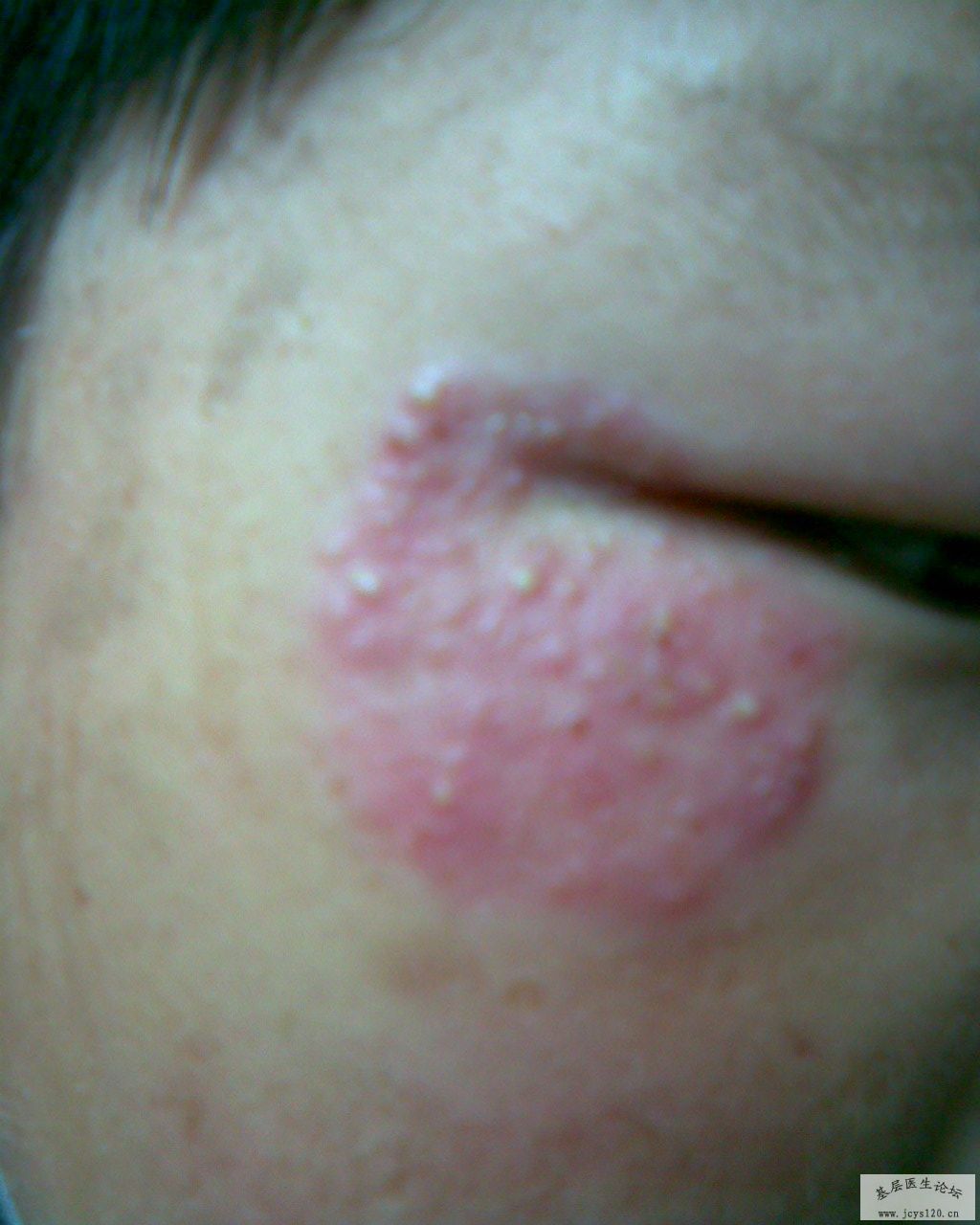 我看是单纯疱疹,可以排除带状疱疹,因为本病好发于成人,春秋季节多见。发病率随年龄增大而呈显著上升。   1、典型表现:发疹前可有轻度乏力、低热、纳差等全身症状,患处皮肤自觉灼热感或者神经痛,触之有明显的痛觉敏感,持续1~3天,亦可无前驱症状即发疹。好发部位依次为肋间神经、颈神经、三叉神经和腰骶神经支配区域。患处常首先出现潮红斑,很快出现粟粒至黄豆大小丘疹,簇状分布而不融合,继之迅速变为水疱,疱壁紧张发亮,疱液澄清,外周绕以红晕,各簇水疱群间皮肤正常;皮损沿某一周围神经呈带状排列,多发生在身体的一侧,一般不超过正中线。神经痛为本病特征之一,可在发病前或伴随皮损出现,老年患者常较为剧烈。病程一般2~3周,老年人为3~4周,水疱干涸、结痂脱落后留有暂时性淡红斑或色素沉着。需要强调的是 引起带状疱疹的起因是由于长期缺乏运动和锻炼 不是说老年人容易生这个病 是老年人更会坐着不锻炼 所以以老者居多   2、特殊表现:(因本例是面部其他的就不多讲了)   眼带状疱疹(herpes zoster ophthalmicus):系病毒侵犯三叉神经眼支,多见于老年人,疼痛剧烈,可累及角膜形成溃疡性角膜炎。而本病例主要是有痒。治疗我看用氯霉素针2支+地米2支外擦口服消炎清火药,饮食宜清淡忌荤腥刺激性食物。