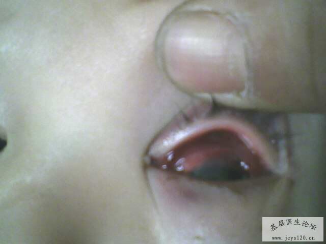 大家好,我昨天看的一个病人,发上来和大家讨论讨论 患儿男,1.5岁,三天前无明显诱因出现右眼发红,晨起有少量分泌物,非脓性,在当地卫生室诊断为红眼病,肌注治疗两天无效(具体用药不详),遂来我所诊治,查见患儿右眼睑结膜及球结膜充血红肿,有少量血性分泌物从右鼻孔流出。T 38.2,咽无红肿,余(-)大家帮忙看看,说说你的初步诊断和处理方法另外,我是新手,第一次发帖,有什么不对的地方请大家指正,谢谢大家!!!