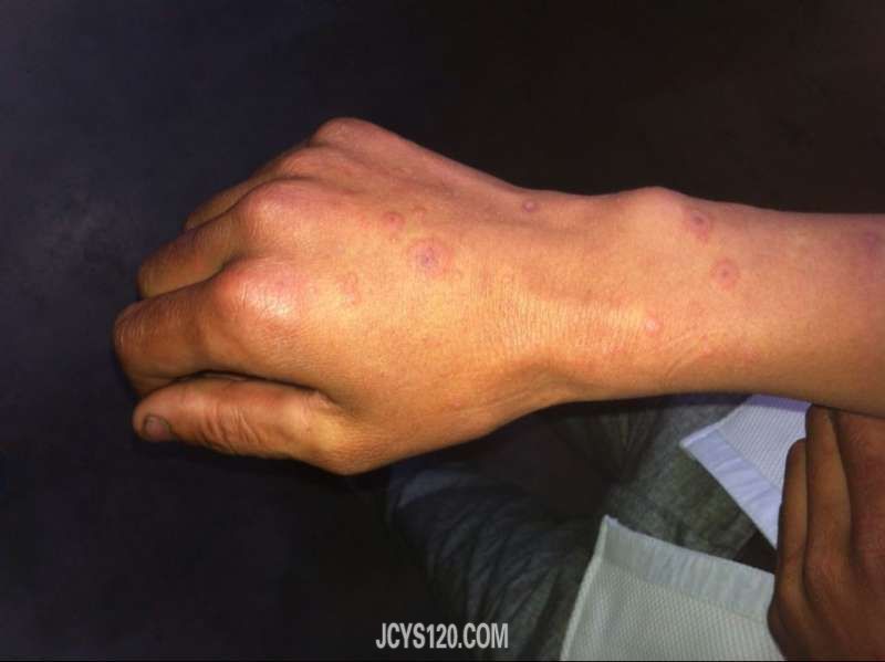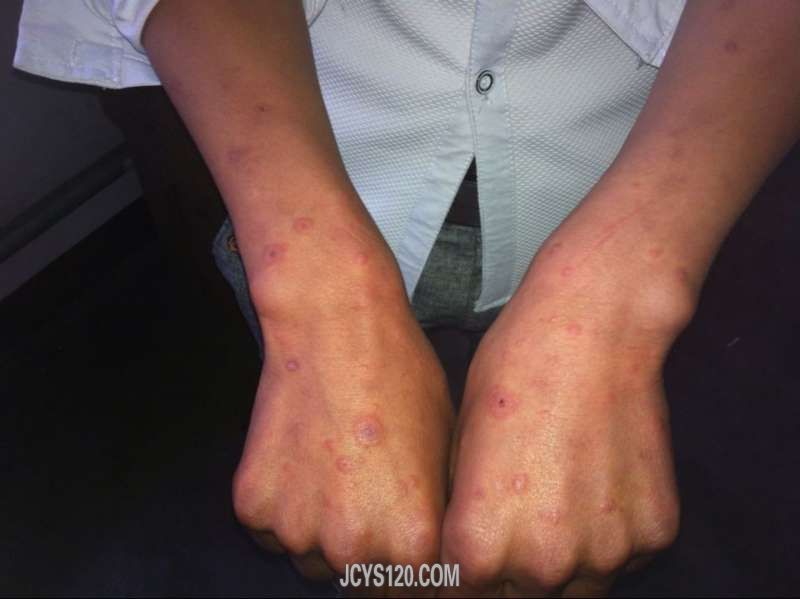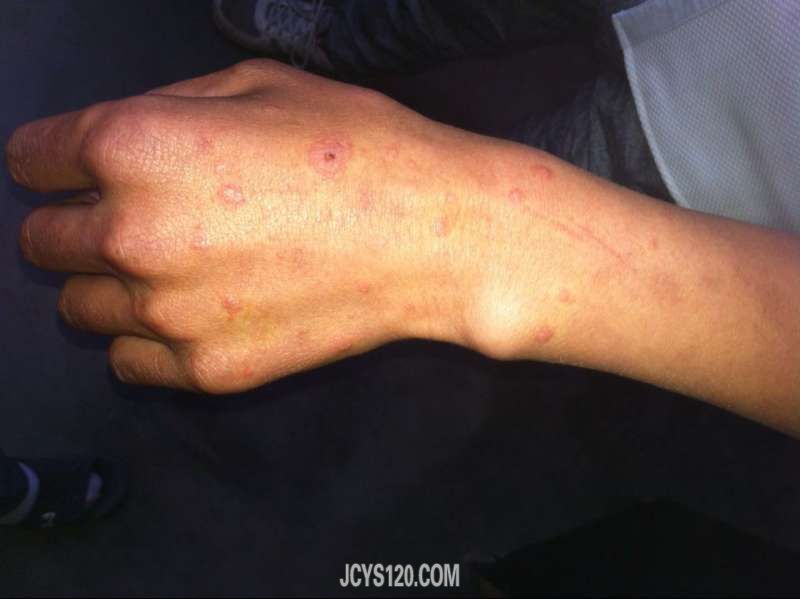 简要病史:一年前患者接触凉水后双手出现红色丘疹,痒得厉害,时隔几天皮损中间出现黑点,如照片。曾用过各种膏剂,效果不好。