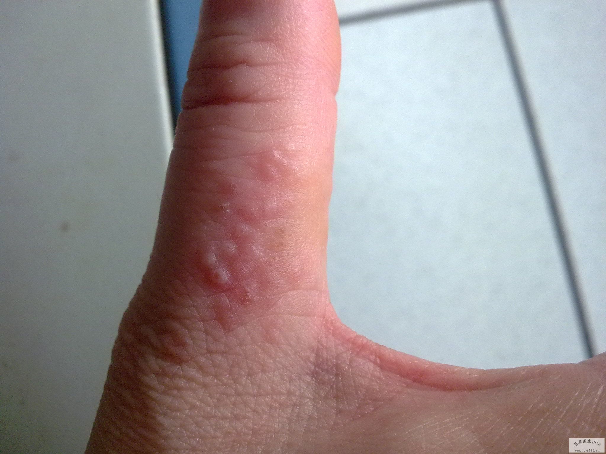 感觉是真菌病,水疱型手癣或是癣菌疹,不过治疗方法是一样的。抗真菌就行了。