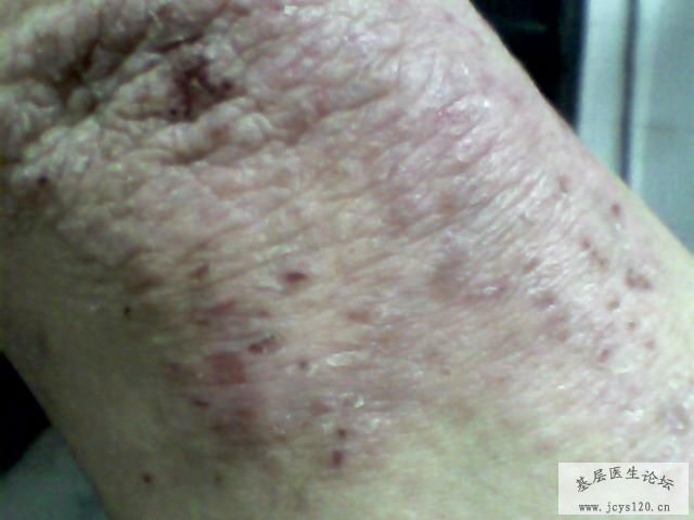 赞同各位楼主们的意见,考虑神经性皮炎苔藓样变。 治疗:1.解除患者紧张、焦躁情绪,避免搔抓烫洗及摩擦等刺激,生活应规律,注意劳逸结合,忌食各种辛辣刺激性食物。 2.局部治疗。(1)皮质类固醇激素软膏、霜或溶液,如倍氯米松乳膏、曲安奈德乳膏及溶液、哈西奈德乳膏及溶液、恩肤霜等。(2)焦油类制剂及止痒剂,如10%黑豆馏油软膏、复方樟脑醑等。(3)局部封闭,可选用醋酸曲安奈德与2%利多卡因按1:2配用局部皮损内或皮下注射,一般1~2周一次,然后可用肤疾宁、皮炎灵贴膏局部外贴;也可用强的松龙25mg与2%利多卡因2ml混配皮损注射。 3.全身治疗。主要适用于播散型,可选用镇静剂及抗组胺药,如皮损瘙痒剧烈可予扑尔敏、赛庚啶、息斯敏等:神经衰弱者给予安定、谷维素等。对于病情较重泛发者予以5%GS500ml+普鲁卡因150mg静脉封闭qd,每3天增加普鲁卡因150mg,直至450~600mg/d为止,10d一疗程(注:普鲁卡因须皮试)。也可加用10%GS.Ca静注。 4.物理疗法。适用于皮损肥厚顽固者,可试用同位素90鍶等敷贴、液氮冷冻。 5.中医药疗法。根据辨证选用荆防汤或消风散、养血润肤汤、龙胆泻肝汤进行加减,及针刺疗法。
