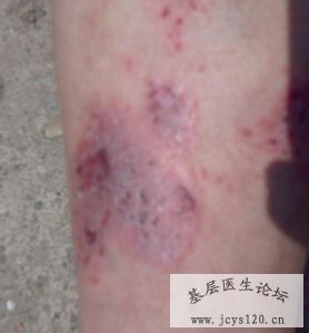 患者 男 47 岁 主诉:09年11月份将右侧小腿中部磕伤出血 后结痂形成2cm见方暗红色瘢痕 冬天上班骑摩托车后 患者感觉此处冻到(痒)自用冻伤膏 瘙痒未有好转持续到现在并加重 病处扩大 未有其他治疗