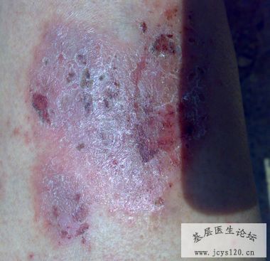 患者 男 47 岁 主诉:09年11月份将右侧小腿中部磕伤出血 后结痂形成2cm见方暗红色瘢痕 冬天上班骑摩托车后 患者感觉此处冻到(痒)自用冻伤膏 瘙痒未有好转持续到现在并加重 病处扩大 未有其他治疗