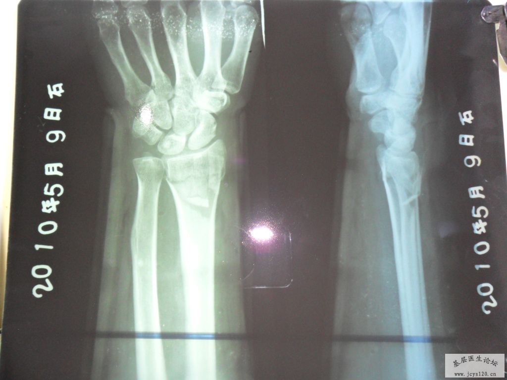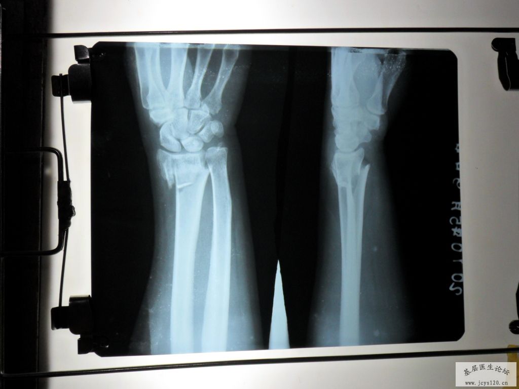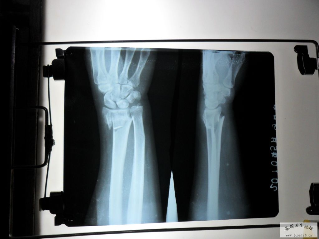 很常见的骨折,每月都能碰到,复位不错但骨折远端仍向背侧有少许移位,固定时用科雷氏夹板固定掌屈位位置会更好。用石膏固定尺偏掌屈位也行。