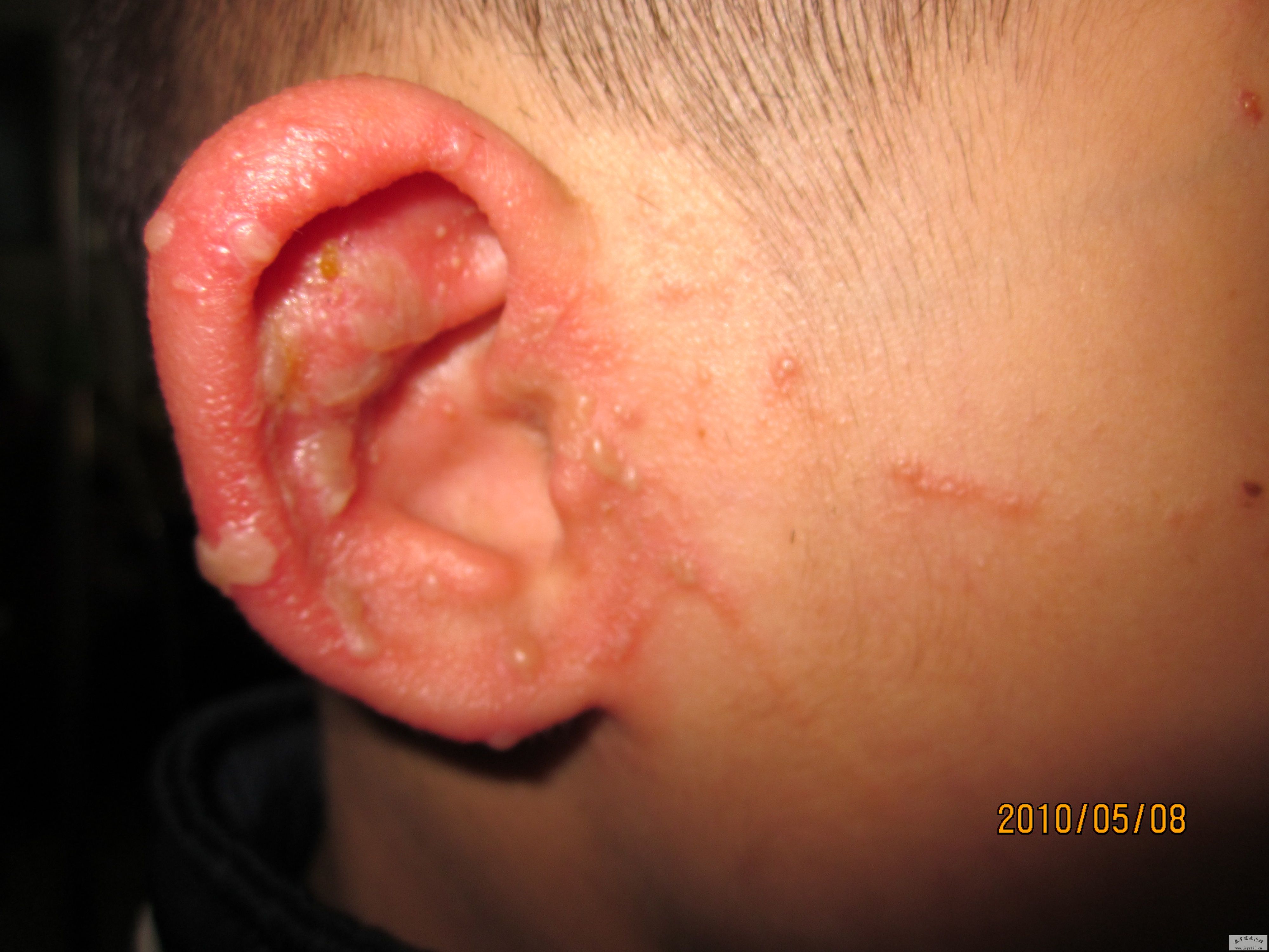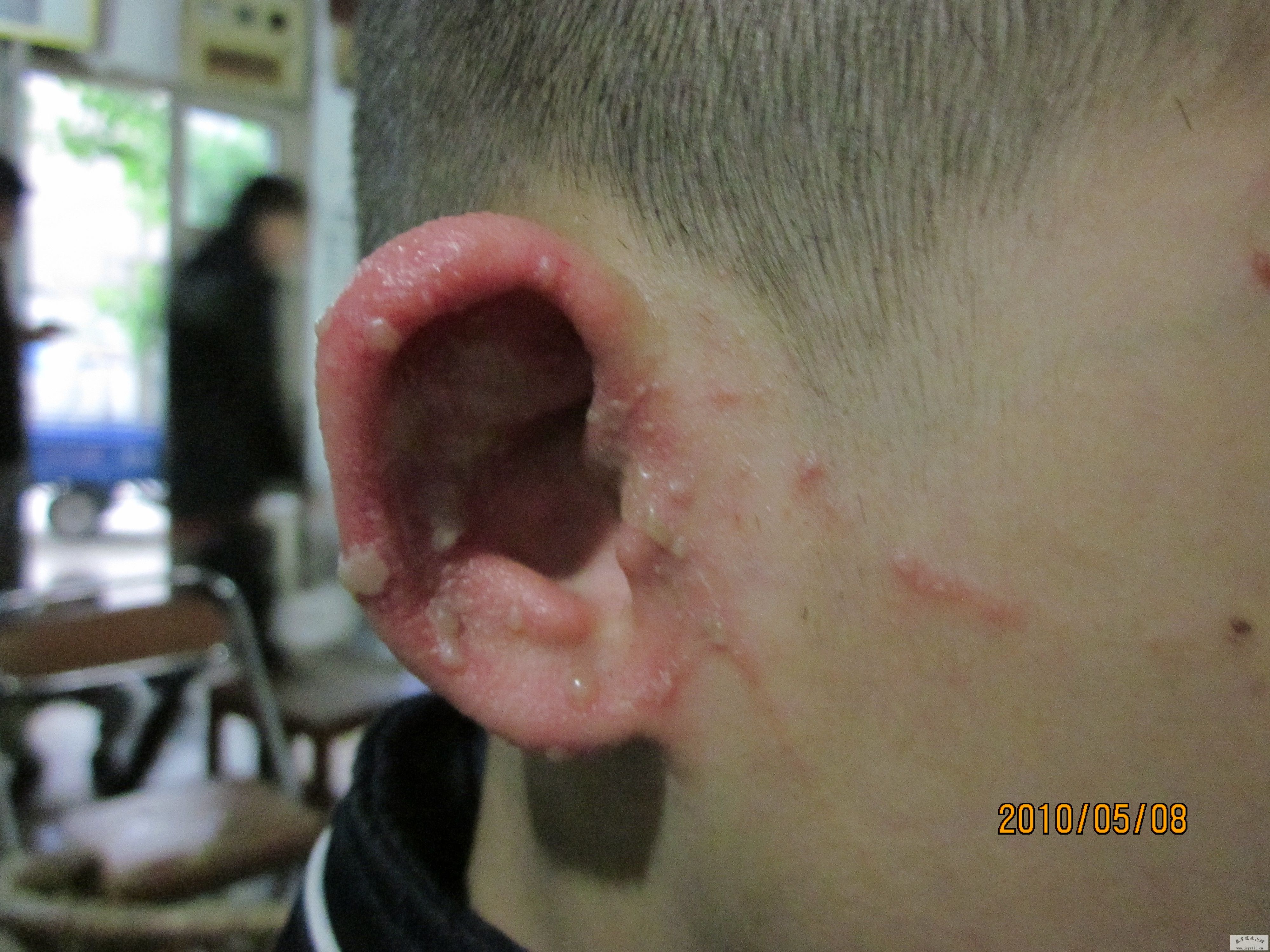 前几天接诊了一个小孩,右耳不明原因出现散在的几个小疱疹,疱壁紧张发亮,内容清澈,微痒。局部皮肤微红。治疗两天后如图所示: