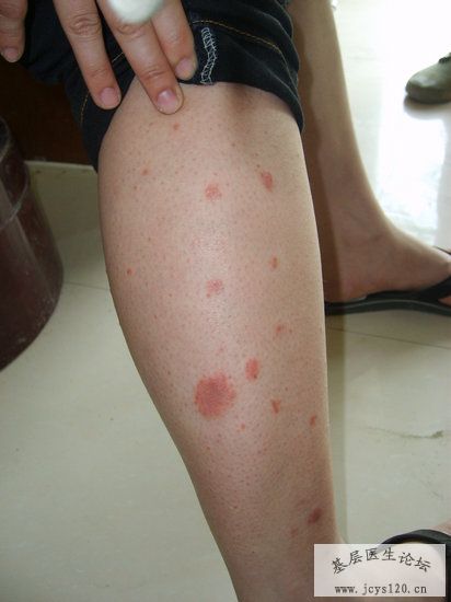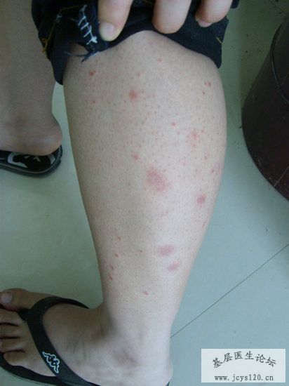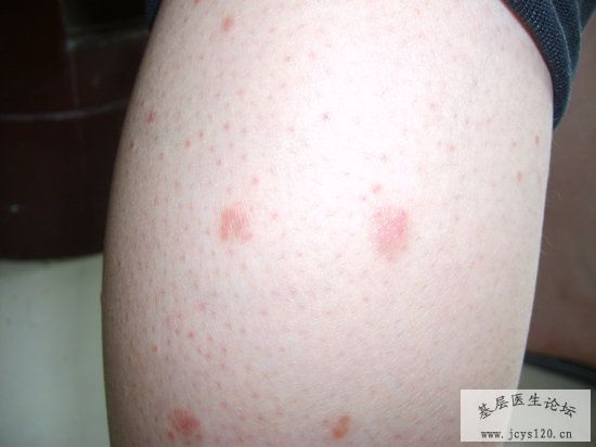 患者,女,23岁,一年前开始出现皮肤皮疹(如图),皮疹压之变白。起初为散在的极小块,后慢慢增多,瘙痒,遇热瘙痒厉害。皮疹只见于四肢外侧,躯干及面部未发现。曾在各个药房自行购买或经药房推荐使用许多的外用膏药(具体不详,据说是治疗癣类药膏),擦之有效,但效力不持久,几天后马上复发。