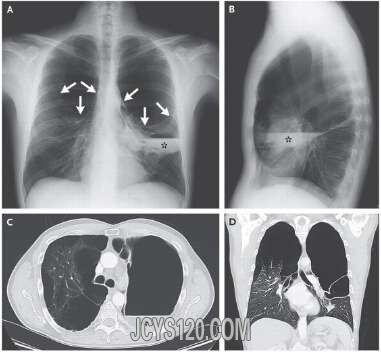 胸部X线检查表现为两肺尖及上叶的广泛性肺大疱(图A箭头处;图B),表明为消失肺综合征;左肺可见气-液平面(图A,B,C的星号处)。胸部CT证实以上结论(图C;图D)。