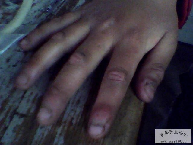 这人是从事什么职业的?感觉是练拳击的且有手脏没洗干净且伴有炎症及真菌感染的迹象;不过想要确定是什么,图片清晰度确实不能反应出问题;也只有模糊的感觉处理方案是:PP粉1/5000液泡水清洗,外用尿素软膏与皮康王交替使用以观察效果。