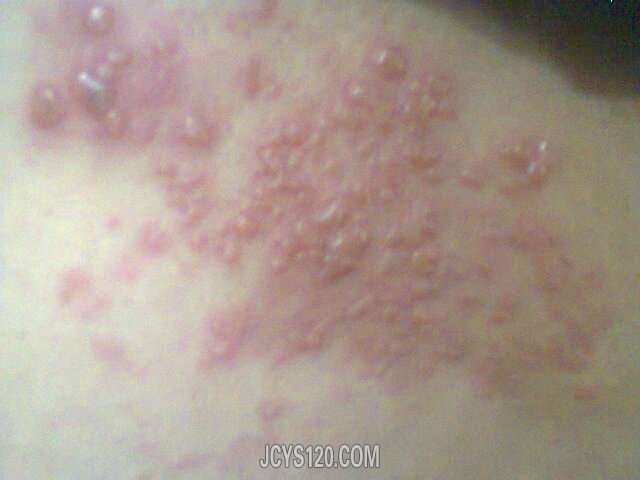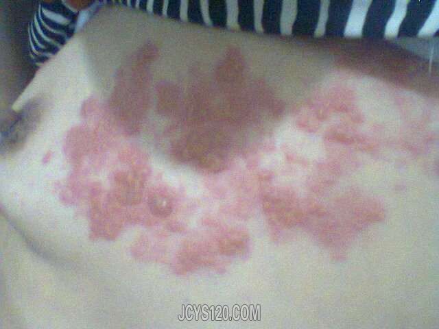 患者,女,59岁,有糖尿病史,不明原因的出现此种疱疹,抚摸有疼痛感,左侧乳房外下象限和背部两处存在,其他地方未见,自行涂抹阿昔洛韦软膏,效果不佳!请大家出出办法!