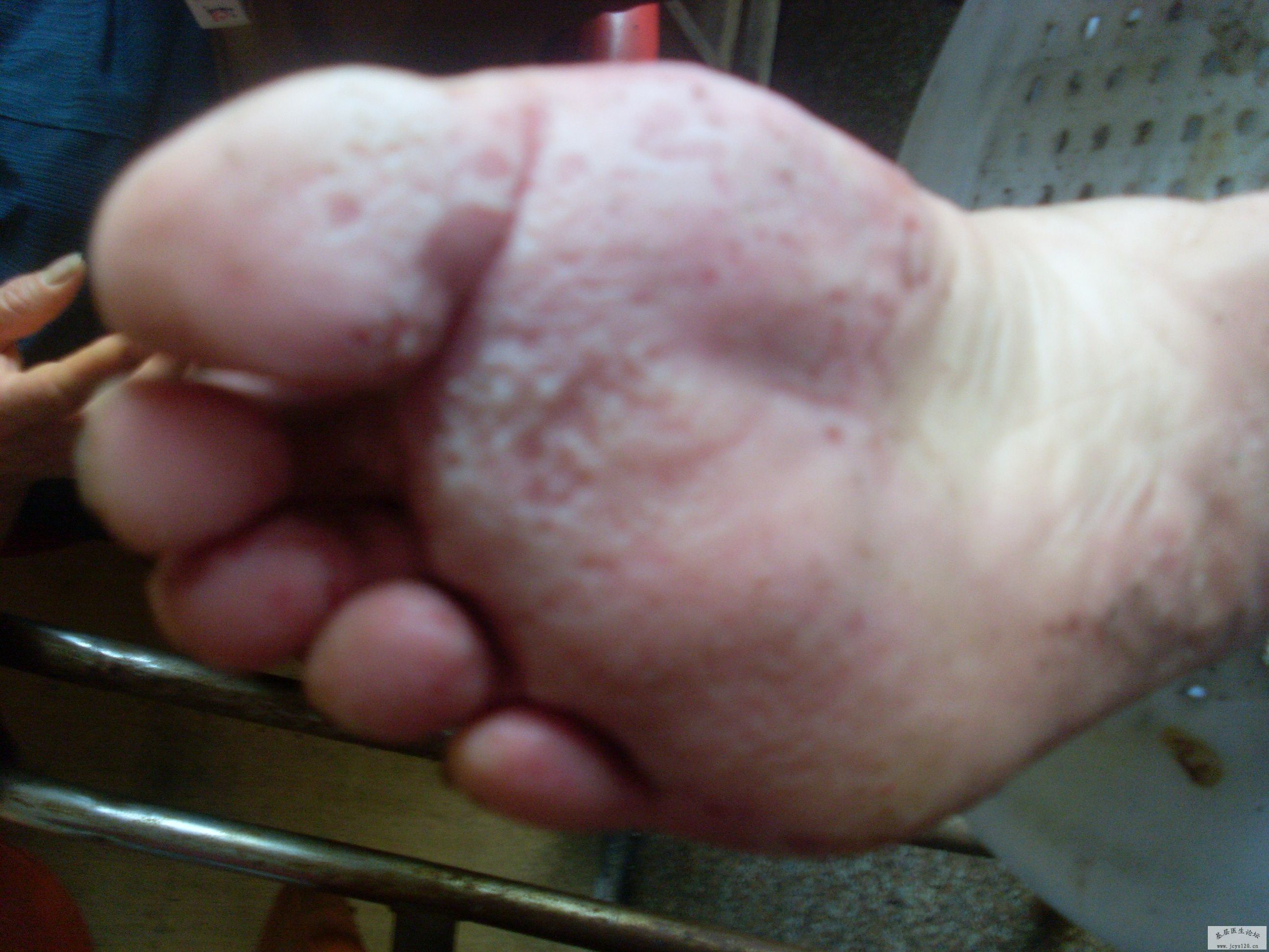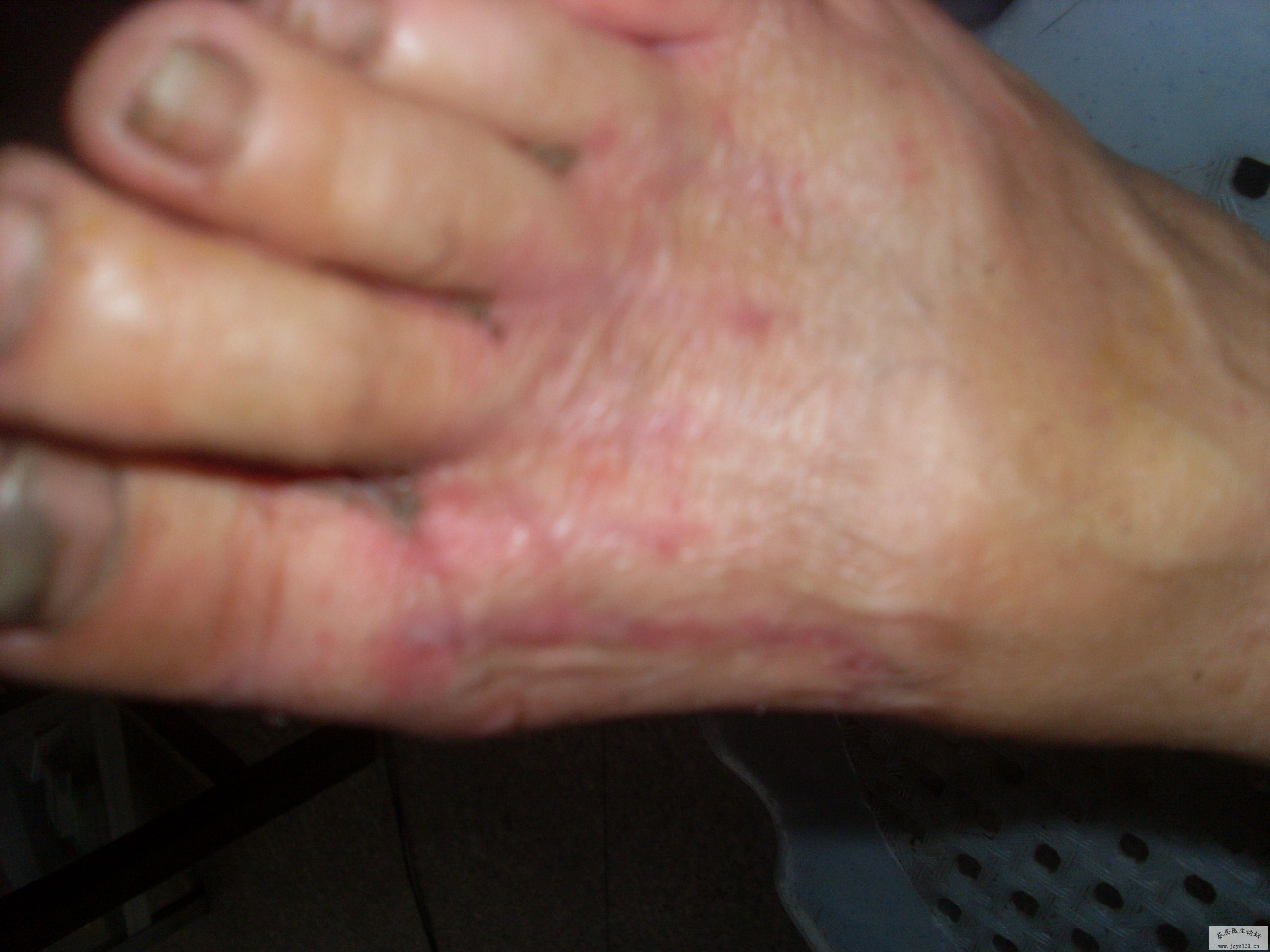 要问清发病原因!是否长期穿拖鞋?看病变部位跟拖鞋的接触面差不多。 whyghhq 发表于 2010-6-27 20:30 http://www.jcys120.cn/images/common/back.gif 的确是长期穿拖鞋 另外此患者在水下工作