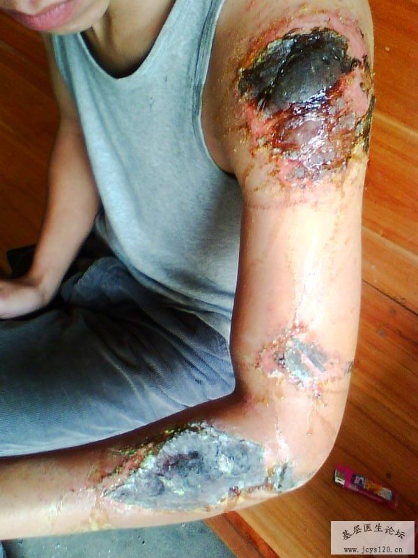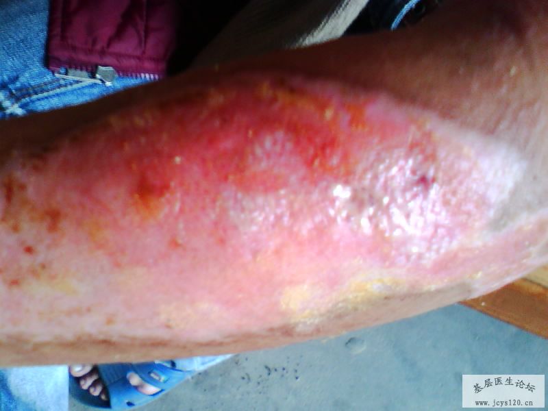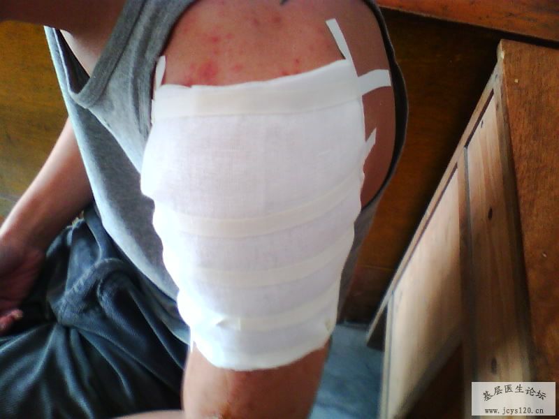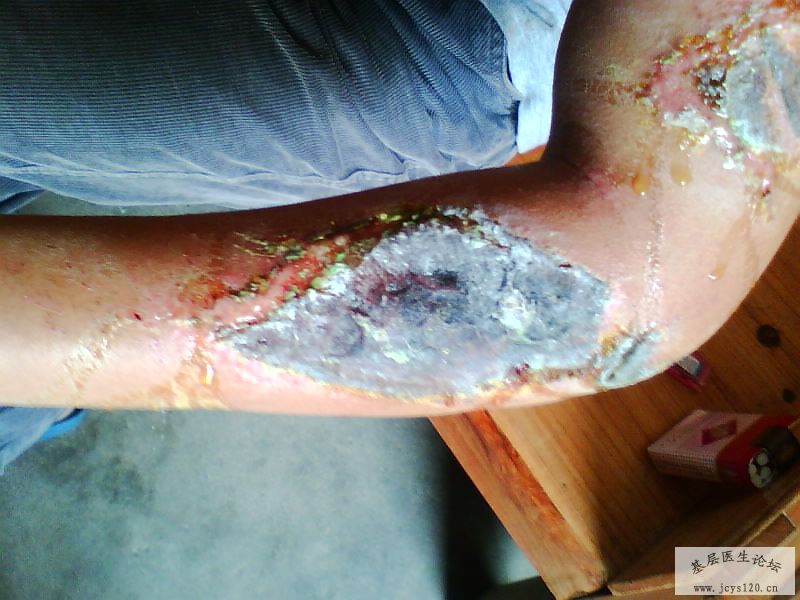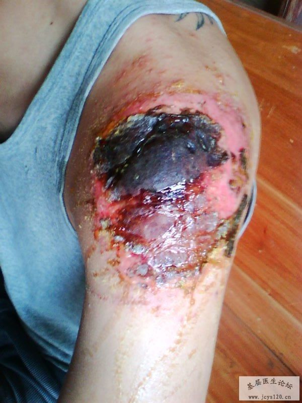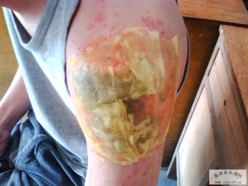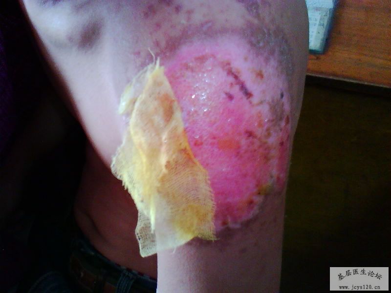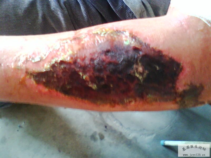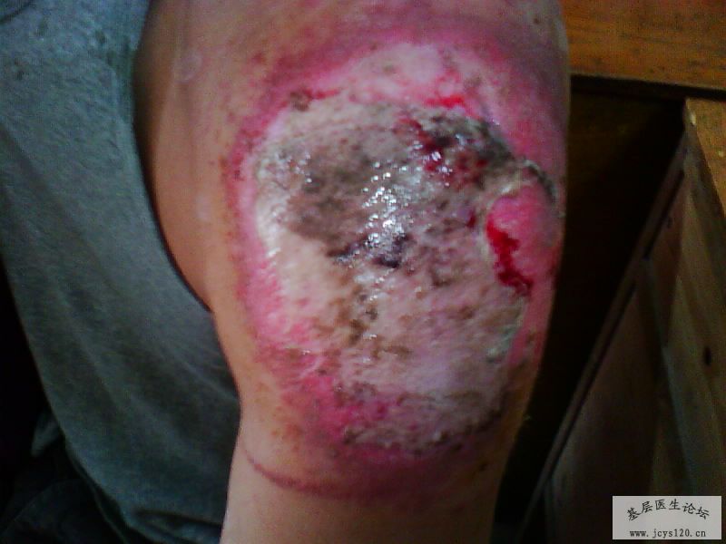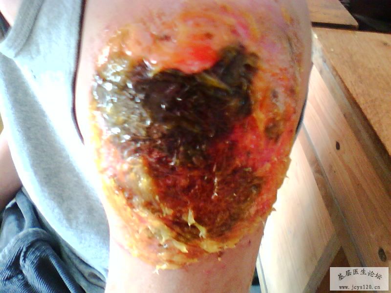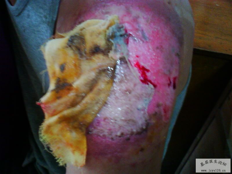 伤口结痂的处理。 外伤或其他原因所成的伤口,常因处理不当, 往往会出现表面干燥而里面化脓的现象,形成一层厚的硬脓痂, 清洗时擦不掉,镊不去,强行撕掉又会造成二次损伤,影响伤口的痊愈。 个人认为出现这种情况时,行之有效的方法, 就是使用有祛腐生肌作用的中药药膏外涂加油纱布包扎, 让伤口湿润由脓痂自动溶化和脱落,让脓痂软化利于清除。 且还可以减少出现疤痕的现象。 此为擦伤四天后的结痂伤口。 将创面简单清洗后,涂上药膏,贴上油纱布,包扎。