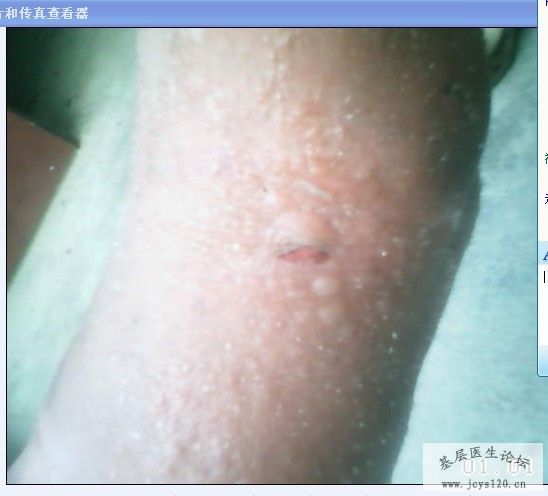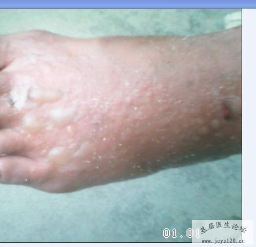 男,50岁,砍柴后感觉脚上有点痛,自以为是扭伤了,就擦了正红华油,第二天就如上面图,有些痒也有痛, 关节也痛 给予 5%GS 250 阿昔洛韦 0.5 静滴 0.9%NS 100 曲松钠 2G 静滴 5%GS 100 地米 5mg 静滴