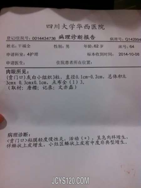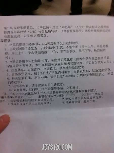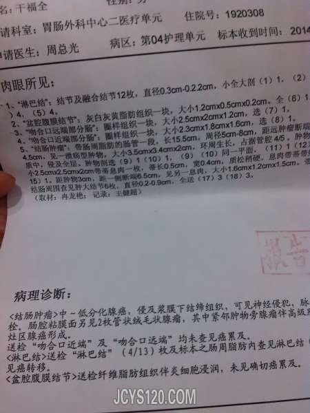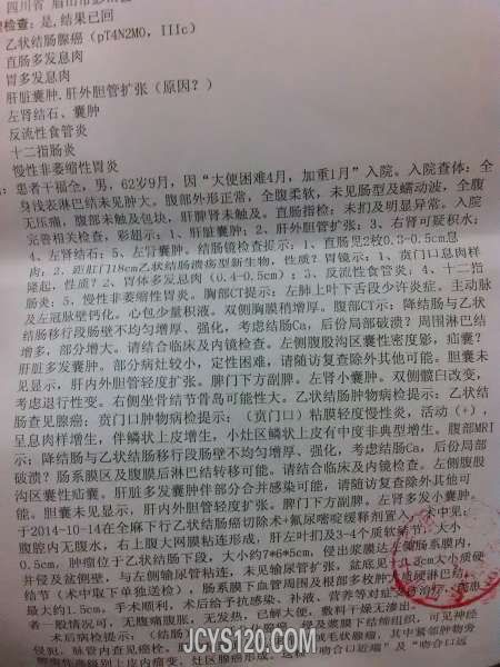 男,62岁,9月底感觉左侧腹部疼痛,大便难下,去县就诊,转市复查,再转省确诊,10月中旬手术后,观察两周出院回家休养。整个过程没用什么药,就是手术后输了一周液。回家也没有开任何药。