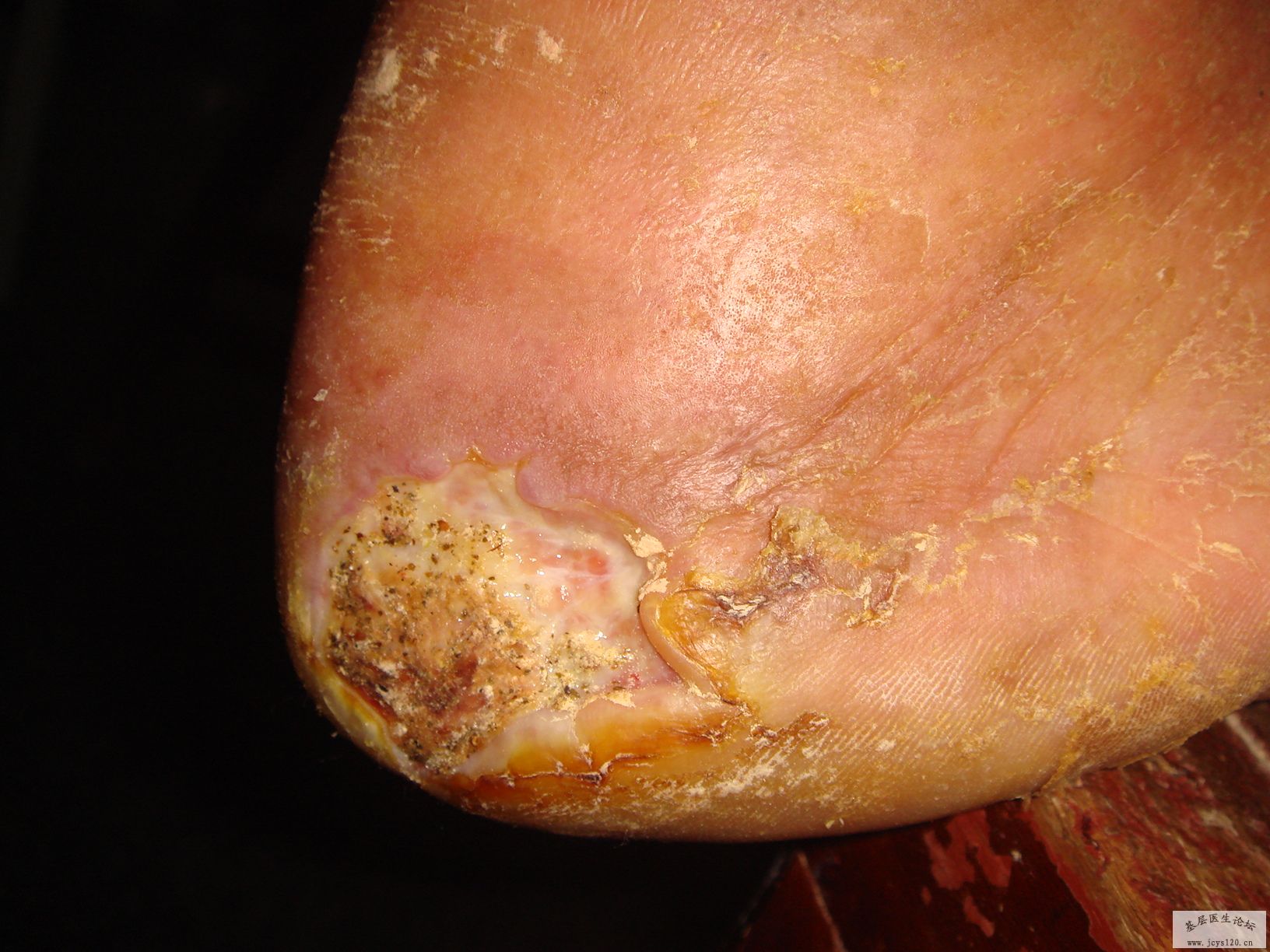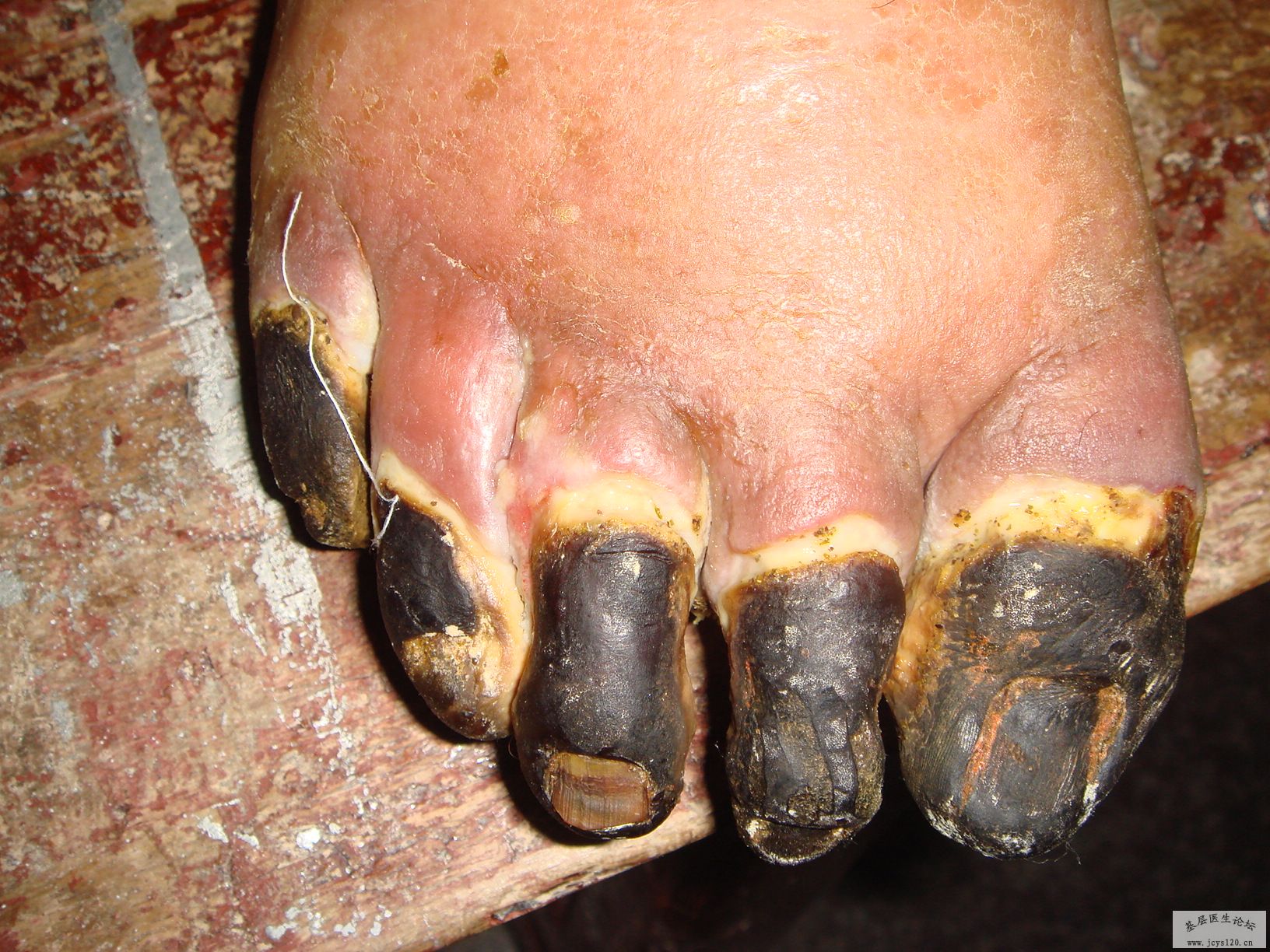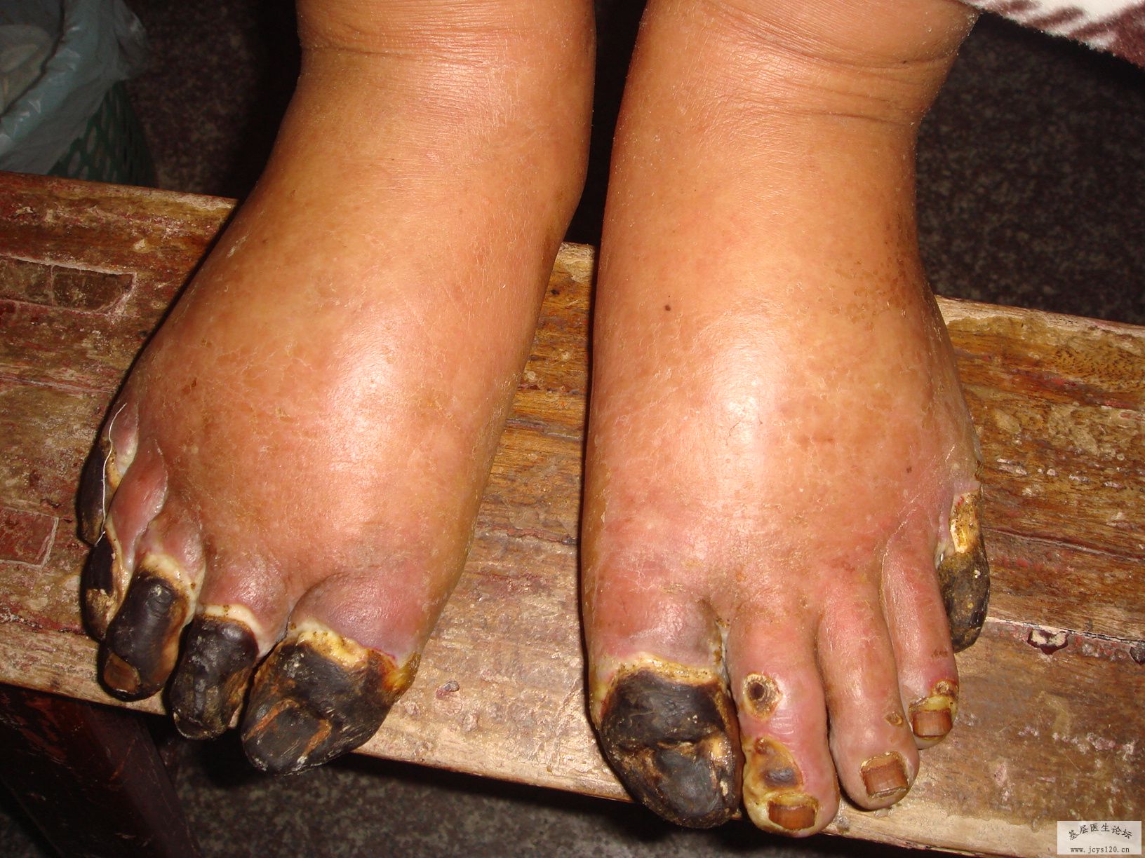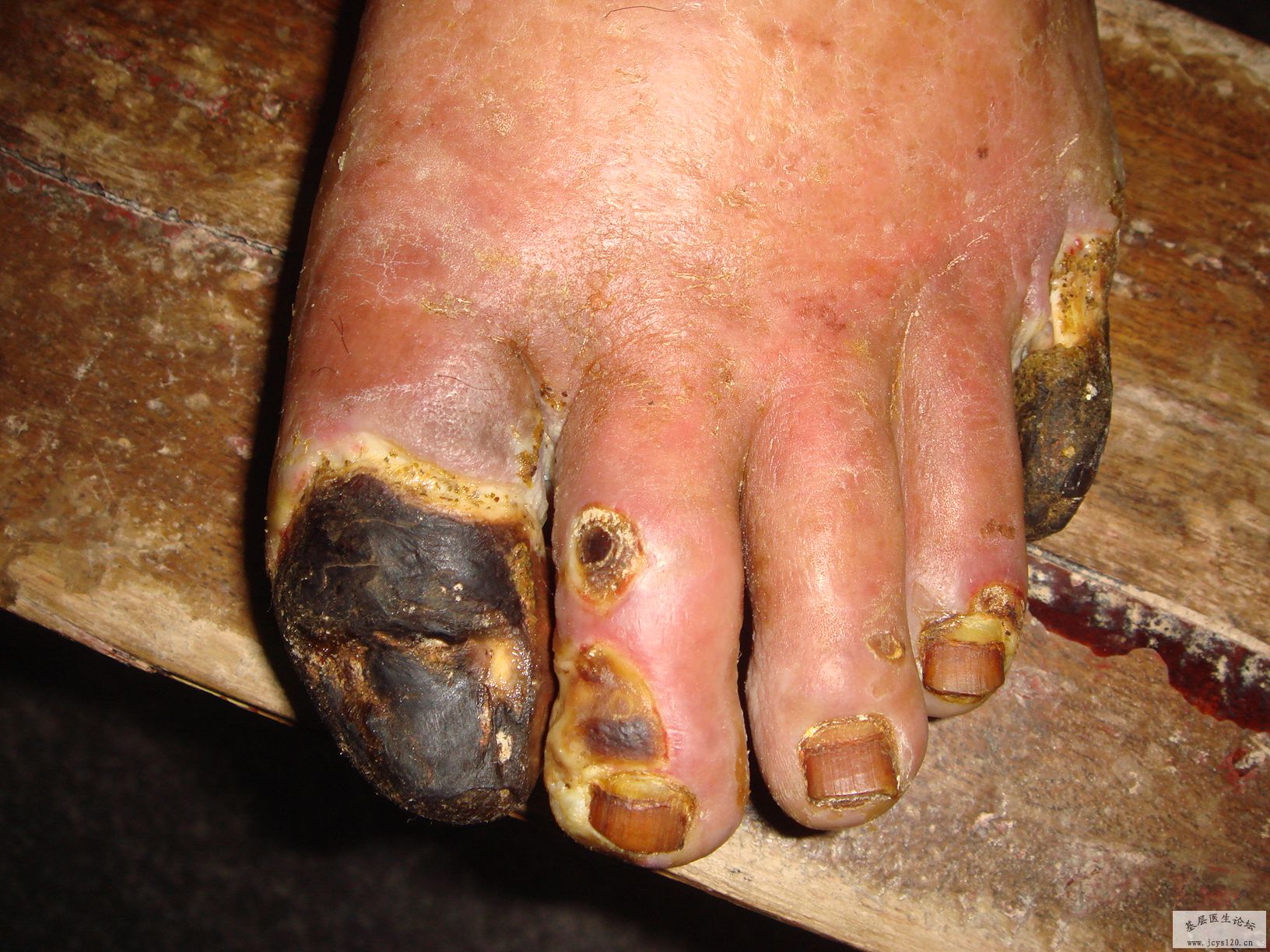 李金庭 男 58岁 糖尿病坏疽7个月 局部情况如图片所示,患者整天不能卧床休息,因为卧床会加剧患肢疼痛加剧,遇冷天疼痛也加剧。