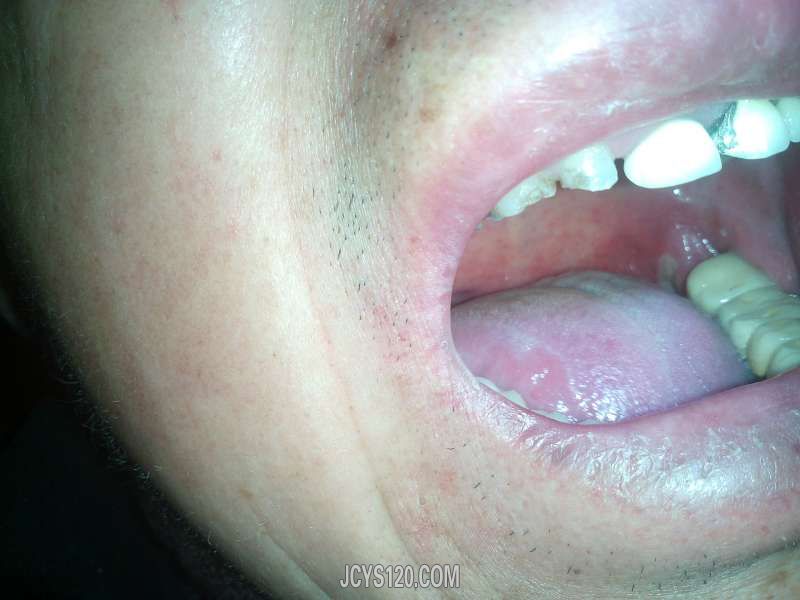 患者,男,70岁,反复发作性口腔溃疡半年。 现病史:半年前患者出现口腔溃疡,最早限于双侧扁桃体,扁桃体不肿大,疼痛不明显,只是感觉吞咽是有不适。在诊所输液治疗无效,发展到上颚,腭垂,咽后壁都是,后转入县人民医院住院治疗,住院5天不见好转,后转入省级医院,在省级医院住院9天治愈,听患者说,省级医院诊断是口腔溃疡。患者回来后一周左右就复发一次,复发部位在咽后壁。如绿豆大小。口服药物头孢克洛缓释片,银黄颗粒,b2片,6天痊愈。之后患者基本上就是半月要发生一次。而且在上颚经常出现血泡。一周前患者再次在右侧扁桃体处出现溃疡面,如黄豆大小。口服上述药物两天,右侧溃疡面扩大如花生大小,左侧也出现溃疡面如花生大小。上颚有一黄豆大小血泡。咽红。饮食正常,二便正常。 既往史:无高血压,糖尿病史,前列腺史1年, 查体:右侧溃疡面扩大如花生大小,左侧也出现溃疡面如花生大小。上颚有一黄豆大小血泡。咽红。饮食正常,二便正常。