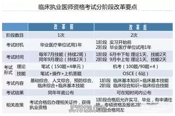 事实上执医考试最早实施的时候就考虑过分阶段,但由于当时的实际情况而没能施行。这次执医考试的改革也是在我国住院医师规范化培训制度全面铺开的基础上进行的,更加符合现有的医师培养制度。本次改革不影响已毕业考生,但在将来,第一阶段的考试的通过与否很可能与医学生有无资格参加临床实习,能否顺利毕业,能否获得申请住院医师规范化培训资格等产生密切的关系(新的执业医师资格考试模式更接近美国执业医师资格考试)。