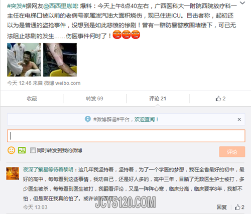上面这段话是新浪微博网友@夜深了繁星等待着黎明 的评论。这是他看到6月16日上午8点40左右,广西医科大二附院放疗科主任被患者泼汽油严重烧伤后,发出的感慨。